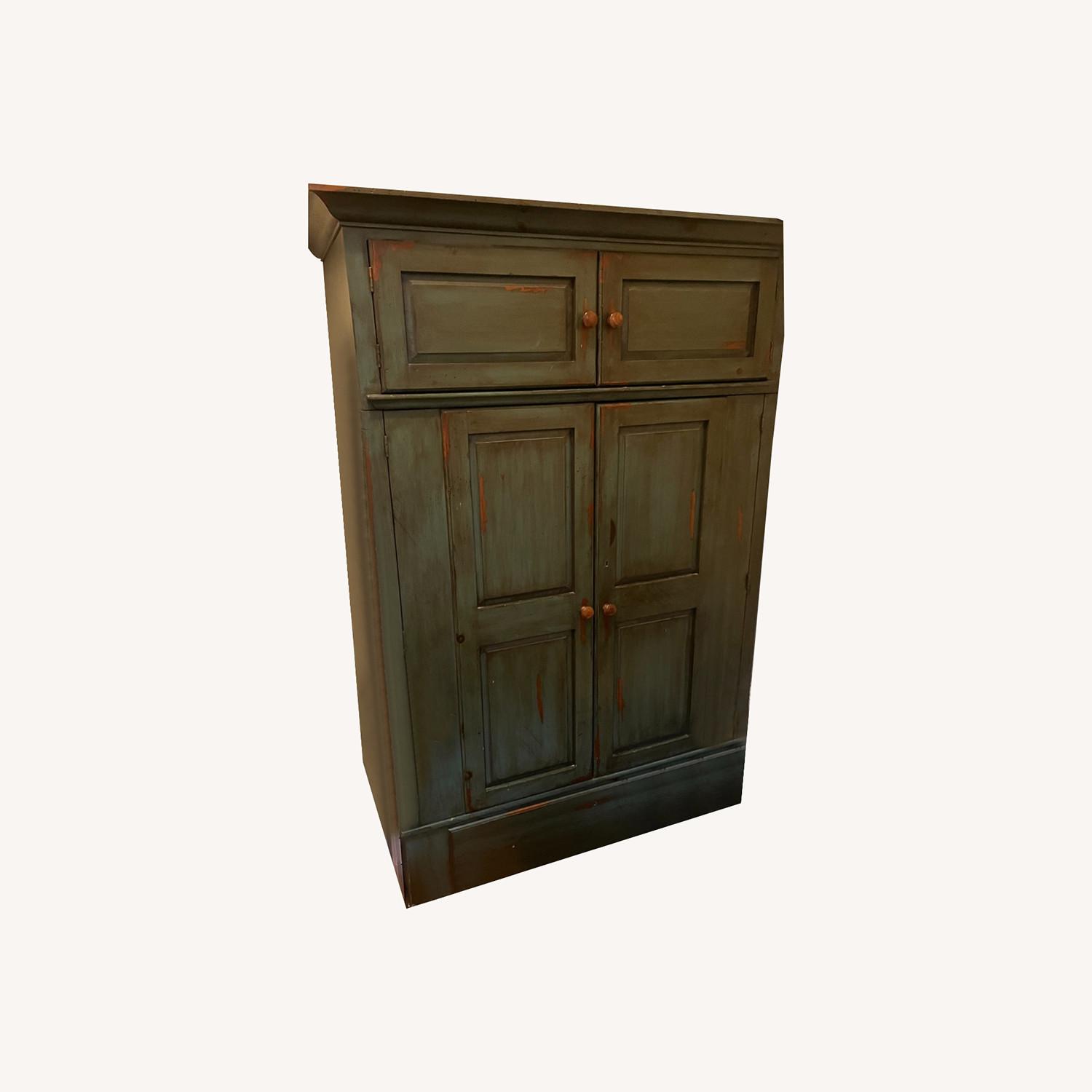Seller's Notes:Rustic-style green armoire crafted from solid wood with a vintage distressed finish. Spacious & versatile storage with two panel doors at top, two middle panels, as well as a bottom pull out drawer. Middle interior has option for built-in cable pass-through so you can run a power cord inside for hiding wires or charging/using it as a media entertainment center. The center panels open fully and can be pushed flat against the outer sides of the cabinet (has a unique hinge design) which keeps the doors out of the way when using the interior space. The interior middle has a sliding pull-out shelf . Comes with four removable wooden feet (legs) if you'd like to raise it off the floor. Dimensions: • Height: 62 inches • Width: 44 inches • Depth: 25 inches