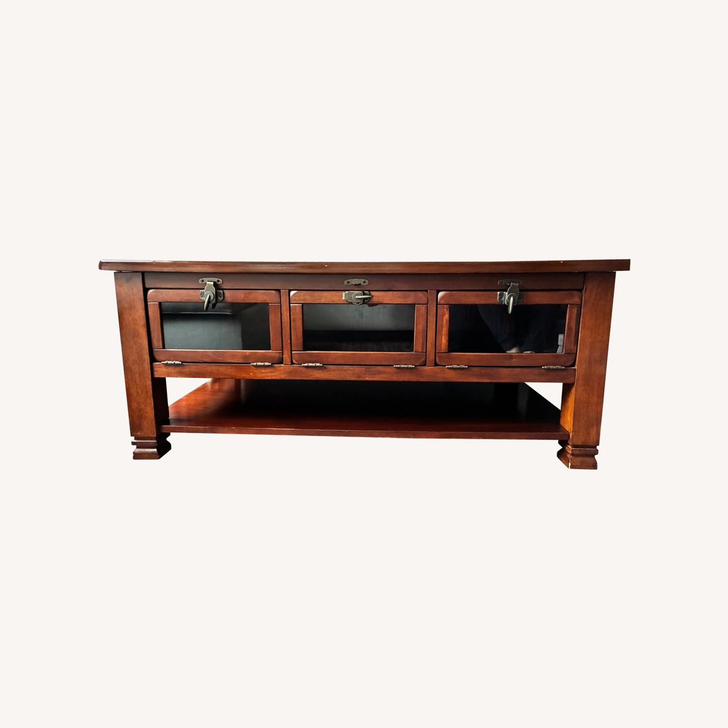 Seller's Notes:Solid Wood Media Chest with Charming Pull-Open Glass Window Panels. Stylish Storage for Any Living Room. Minor scratches on the front edge.