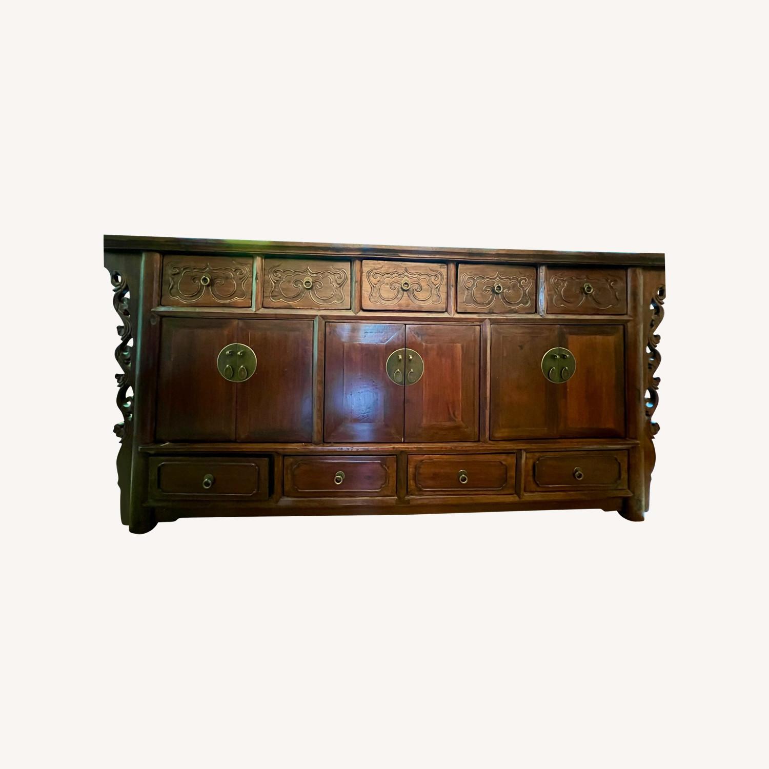 Seller's Notes:This statement piece was purchased from Philadelphia importer Material Culture and has served as a useful sideboard for 15 years. It is solid wood (of unknown species) and has five upper drawers, three lower drawers, and three cupboards. It has the natural surface imperfections of such artisan imported pieces but is not stained or compromised in any way. It comes from a smoke-free home.