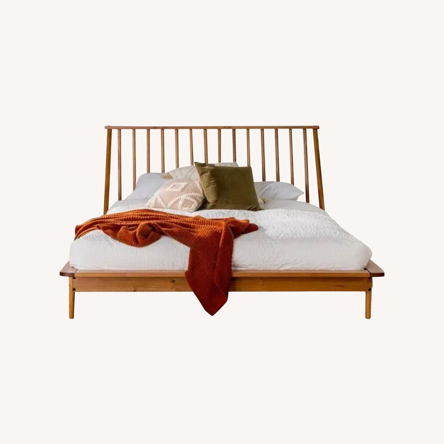 Seller's Notes:Add retro charm to your bedroom decor with this stylish platform bed. The bed is crafted from solid pine wood, available in a variety of finishes, and features a platform base with recessed slat supports to hold your mattress without the need for a box spring. Tapered legs and a spindle rail headboard with slanted accents completes the mid-century charm of this eye-catching bed. Features: Solid pine wood construction Available in multiple finish colors Platform frame with slats (no box spring required) Center support legs Mid-century modern, coastal style Low-profile base Tapered legs Open spindle headboard