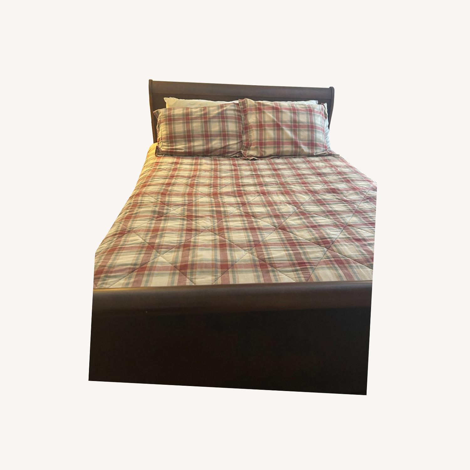Seller's Notes:while a bit on the older side, bed has been rarely used. solid, dark brown wood. headboard, footboard, and side rails. sturdy bed frame