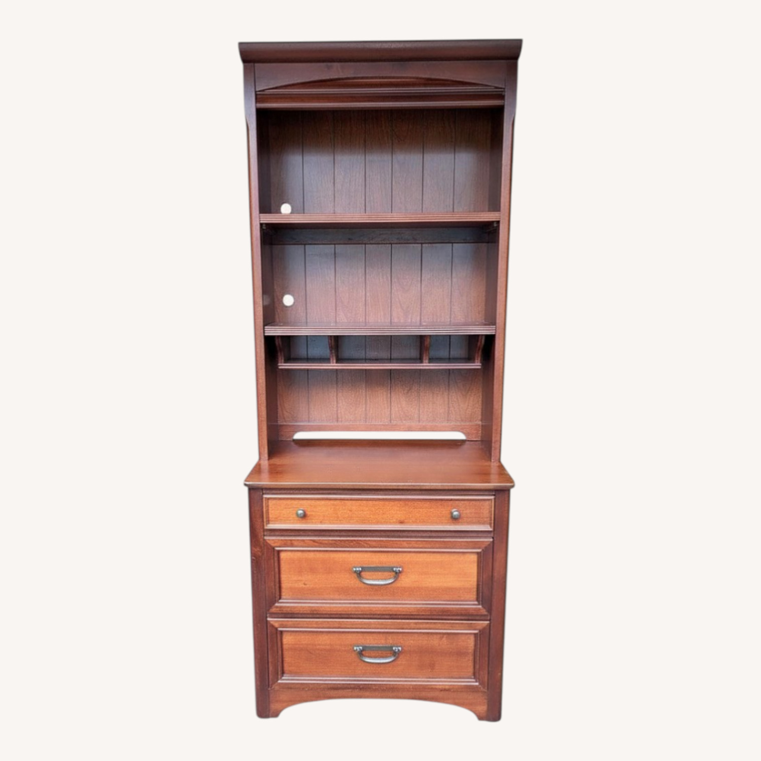 Seller's Notes:Product Overview This is a high-quality, versatile storage solution from the Young America collection by Stanley Furniture. Proudly Made in the USA (Stanleytown, VA), this set features a small 3-drawer dresser with a matching hutch that can be securely attached as a single unit or used separately. Crafted from solid wood with a rich Dark Brown finish, this piece showcases the superior durability Stanley is known for, including authentic English dovetail joinery on all drawers for smooth, lifelong operation. Features & Storage Versatile Design: The hutch features adjustable shelving and nests perfectly on top of the dresser for a compact footprint. Ample Storage: Three deep drawers provide significant storage for clothing, accessories, or office supplies. Quality Construction: Solid wood frame and drawer boxes (not particle board) built to last for generations. Authentic Details: Features original dark-finish hardware and the official Young America manufacturer’s plate inside the drawer. Condition & History Condition: Very Good vintage condition. The solid wood structure is rock-solid, and all drawers operate smoothly. Ownership: Very Well maintained by a single owner for 20 years in a clean, smoke-free home. Dimensions & Details Combined Height: 76 inches Width: 30 inches Depth: 19 inches Material: Solid Wood Color: Dark Brown