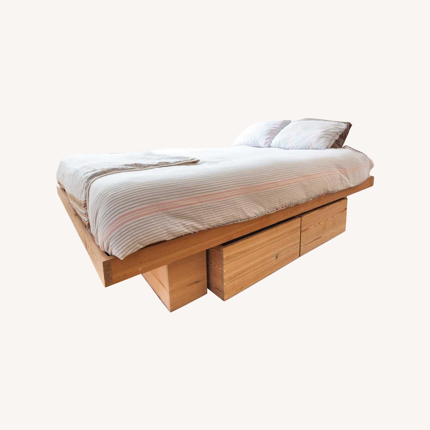 Seller's Notes:Deep storage drawers and solid wood base make this a sturdy, functional bedroom piece. The first 2 photos are stock photos, but the dimensions and other pictures are accurate to the piece. Mattress is not included. Message me for any other info on the bed frame. Please note - it needs to be picked up by end of day Thursday. Delivery fees are covered in the price.