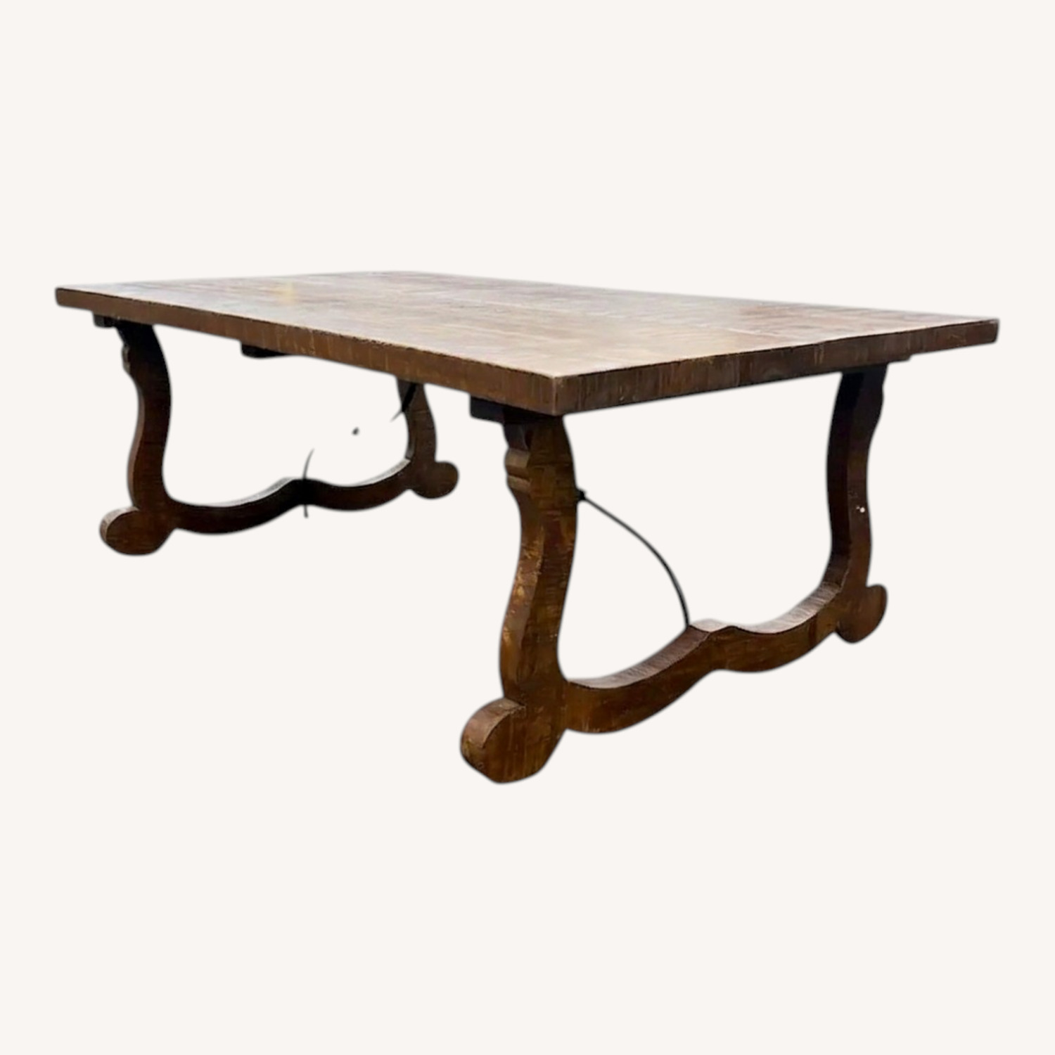 Seller's Notes:Handsome vintage solid wood trestle dining table showcasing beautiful natural wood grain and a warm, time-honored finish. The substantial plank-style top is supported by gracefully carved trestle legs connected with a classic stretcher base, creating both visual balance and strong structural support. Its generous surface and timeless design make it ideal for everyday dining, gatherings, or as a statement work table. Crafted circa 1970s–1980s in a Rustic Farmhouse / Traditional style, this piece captures the enduring charm and craftsmanship of classic harvest tables. Dimension: 52"W x 30" D x 18" H Our pieces are new or showroom floor display furniture and decor. While they have not been previously owned, some floor models may show minor signs of showroom handling such as light surface wear or small cosmetic imperfections. We make every effort to describe items accurately and provide clear, detailed photos, but we encourage buyers to review the images carefully and ask questions prior to purchase if additional clarification is needed. Beauty and condition can be subjective. While we strive to highlight both the strengths and any notable imperfections, minor cosmetic variations may be present.