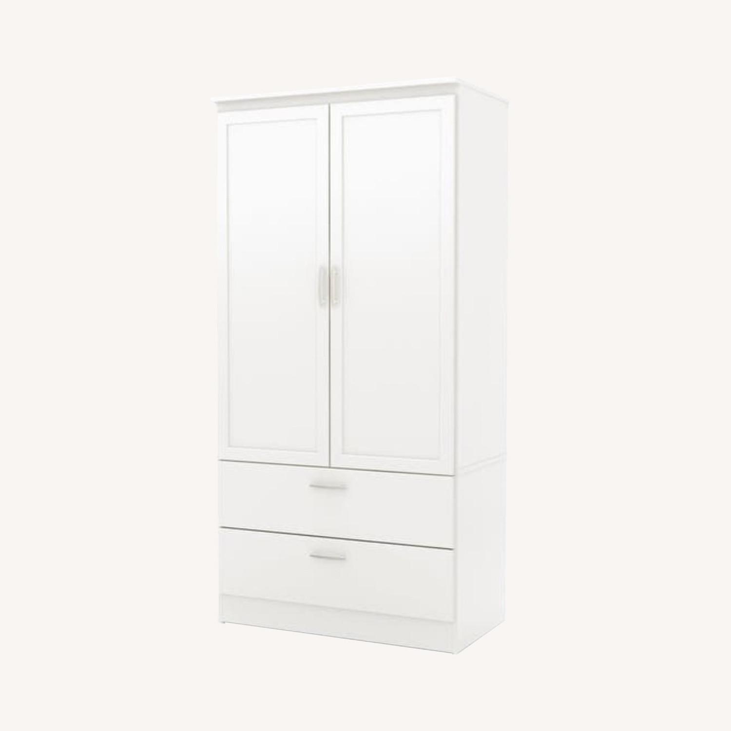Seller's Notes:Have not even had for 1 year! The spacious laminate frame offers two adjustable shelves, a metal hanging rod, two hanging hooks, and two large drawers. Choose from four finishes to complement your existing decor. Features: Laminate frame Nickel-finished metal hardware Contemporary style Grey oak, black, chocolate, or white finish 2 framed doors 2 adjustable shelves Metal hanging rod 2 hanging hooks on door interior 2 large drawers Includes hardware Requires assembly Measures 71 inches high x 35.5 inches wide x 19.5 inches deep