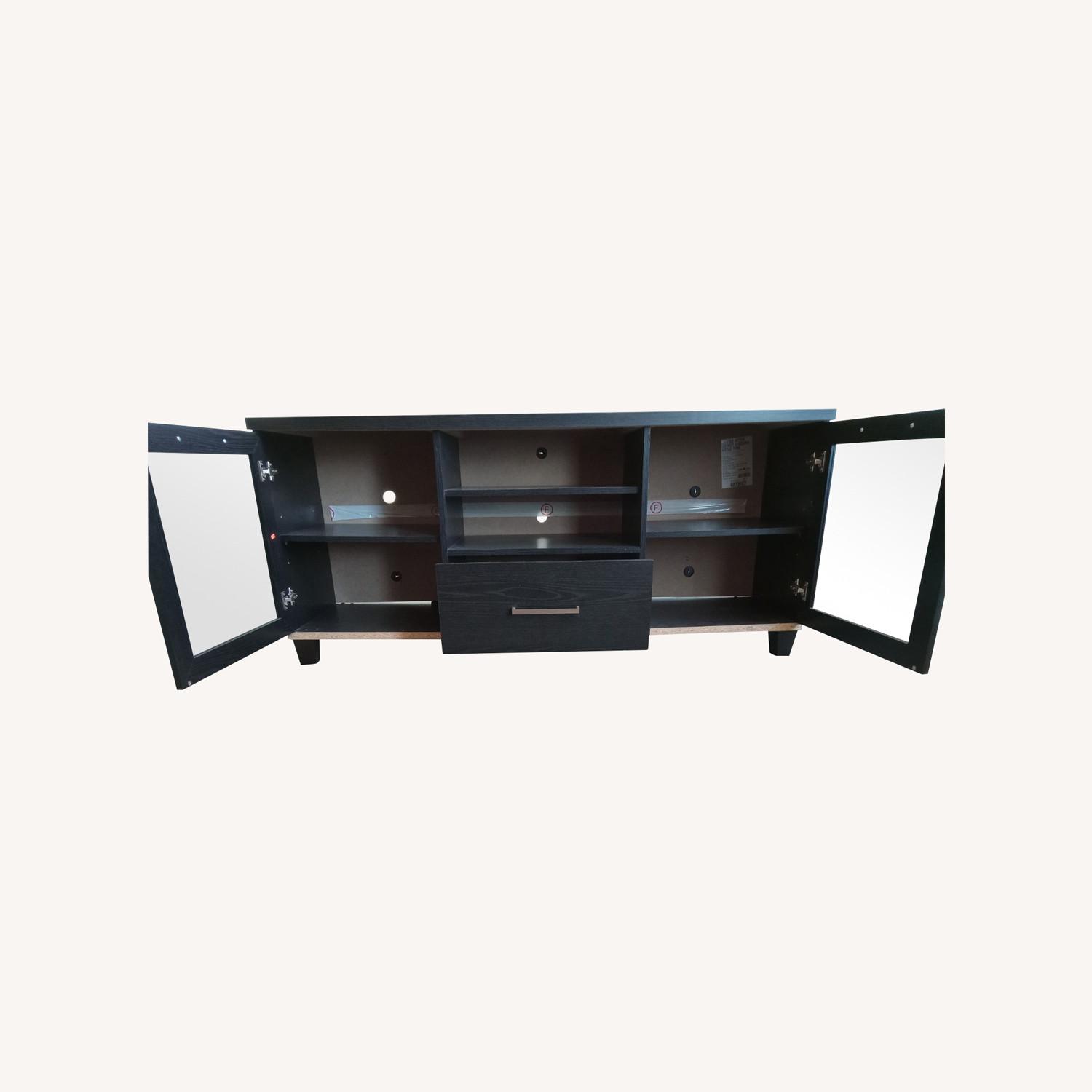 Seller's Notes:Eliminate the clutter of cables with this South Shore Adrian TV stand. Holes in the back ensure you can connect up a variety of consoles or DVD players, and the stand itself can take a 60-inch TV. Sufficient storage space, including two glass doors, allows you to put plenty of items in this South Shore Adrian TV stand. Minor scratches on doors, center leg screw loose. NCI