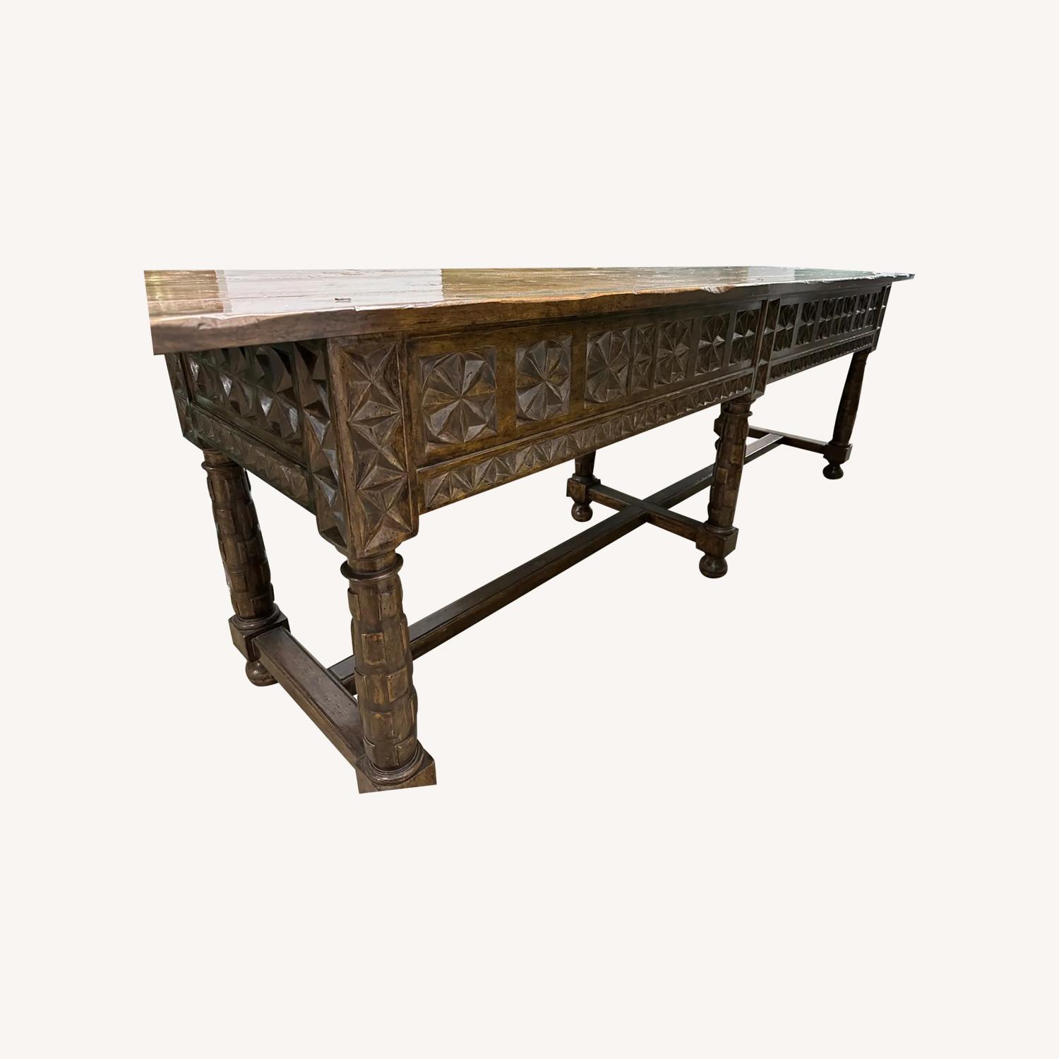 Seller's Notes:Incredible hand-carved wood console table from a private family collection in the Spanish style. This table is made with incredible craftsmanship and is a dramatic piece of statement furniture. It features four drawers for storage is made of solid hand-carved wood. We believe the table is from Holly Hunt in NYC. This piece is very large, approximately 9 feet x 27” depth x 35” tall.