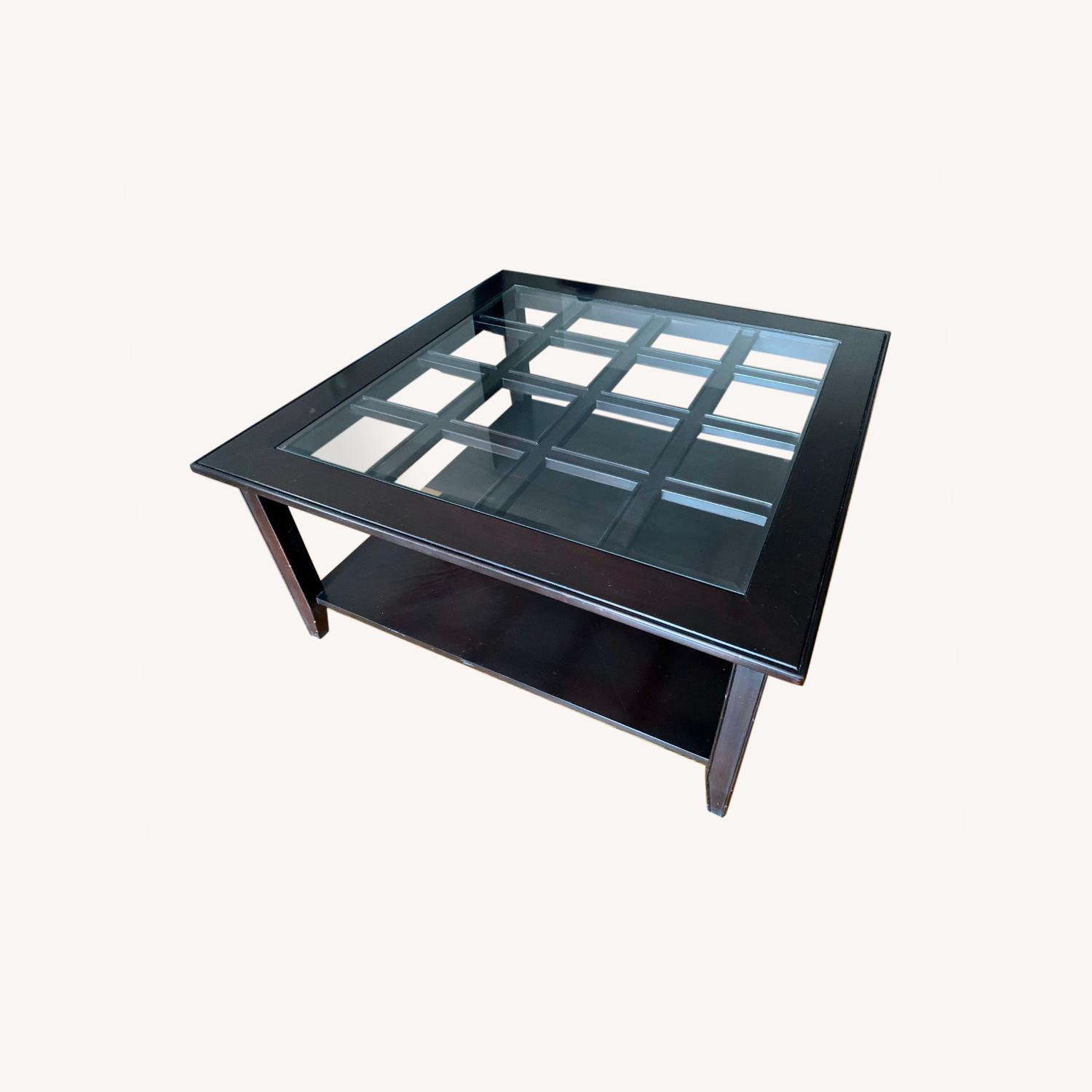 Seller's Notes:Coffee table by Stanley Furniture with square top and inset glass top displaying decorative mullions underneath. Four legs have a gentle, subtle taper. Square table top is 40" and height is 19". Glass top is in excellent condition and can be easily removed for cleaning. Storage baskets and boxes can be added underneath for more storage. Heavy and very durable. Minor scratches and discoloration (which can be easily covered with some décor) on wooden table top from normal use.