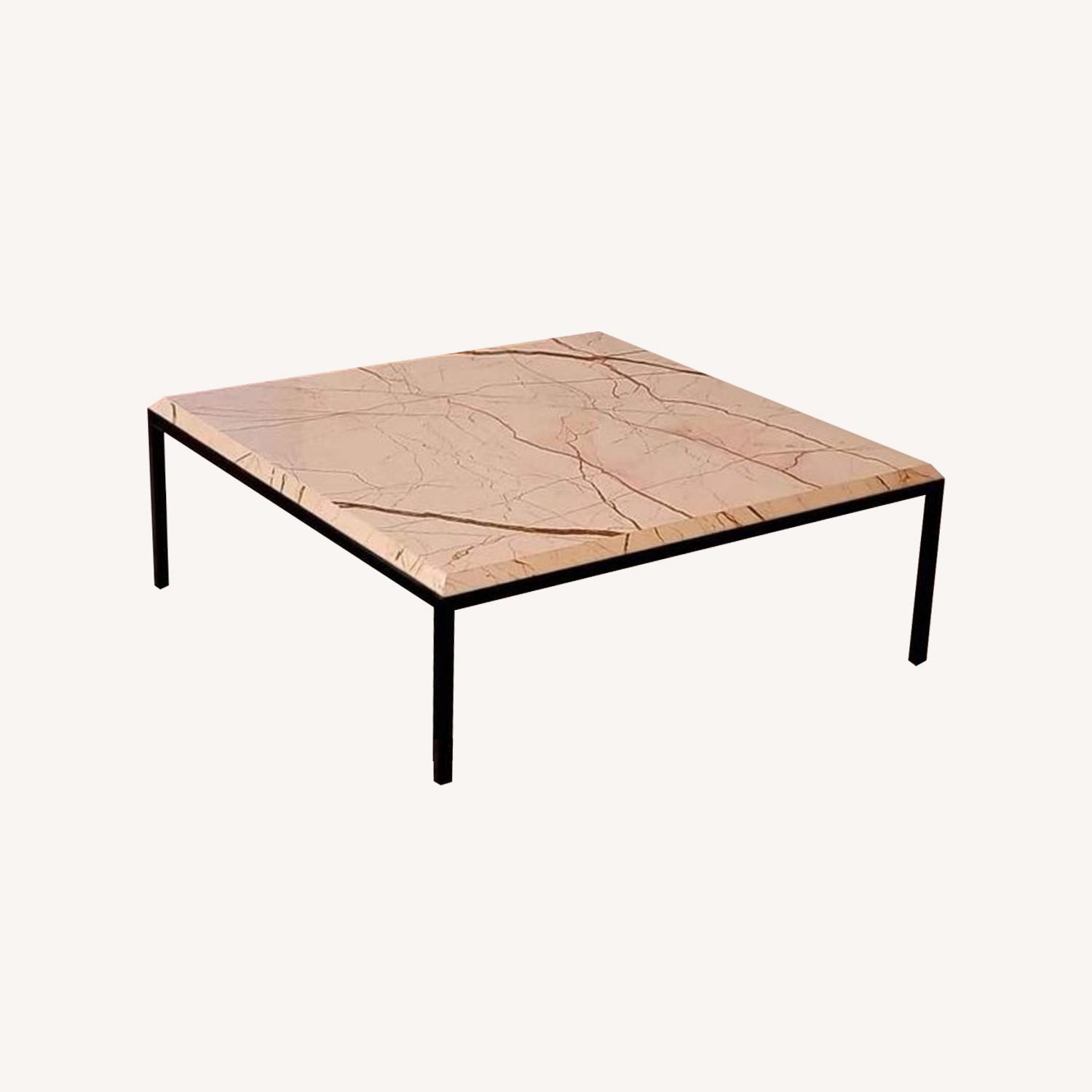 Seller's Notes:A modern take on a vintage silhouette, marble coffee table by Barcelona-based Mermelada Estudio pairs bold form with smooth ivory marble. The slim, burnished bronze frame supports a thick slab of beveled marble, providing a rich counterpoint to the marble's active bronze veining. Square Ivory Marble Coffee Table 40"Wx40"Dx15"H • Designed by Mermelada Estudio • Veneered ivory marble • Iron tube frame with burnished bronze finish