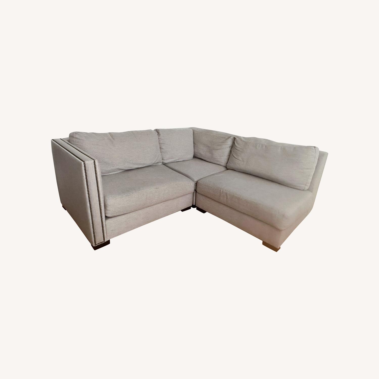 Seller's Notes:Bought on Wayfair four years ago - its no longer available on site but I put a photo of the order. It's a really durable light grey tweed with some fancy stain resistant technology. Its the perfect apartment sized sofa, we searched for a long time to find something this size and this high quality. We're moving and no longer need it, but would love for it to get a new home - it still has a ton of life left in it! For a more modern look, we have the pillows flipped on the side with no buttons, but you can use them either way. The arm has really pretty antique brass studs, I've kept a blanket over that side so its in perfect condition. It comfortably seats four people, everyone thats sat on it talks about for comfy it is, the cushions are really nice! Only wear and tear is slight pilling (can be removed easily) and the pillows need a little fluffing here and there but its a really well made, high quality sofa!