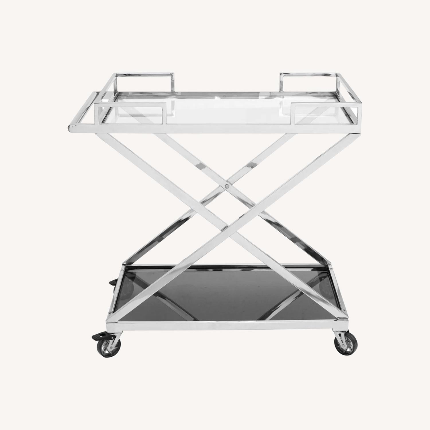 Seller's Notes:This bar cart is only one year old and has barely been used! Modern, stylish, and with plenty of space for storage, it's the perfect addition to any entertainer's living space! (From Vendor) DETAILS Stainless steel and black glass for a classic look. A bar cart is an entertainer's best friend. A great way to serve up treats and snacks, and especially well-suited to displaying a selection of libations! A handy cart on wheels is perfect for the occasional bartender or host. Two-level storage for all your serving needs. Transitional style. Part of Moetini collection. We understand how important your home is and how decorating your kitchen, dining room or bedrooms with classy, contemporary furnishings can help make it a place that reflects who you are. We believe in the power modern furniture has in creating not just a home but YOUR home. We believe in feeling good about our home's environment, and we think you do too. MATERIALS: Stainless Steel Frame, Tempered Glass COLOR: Silver DIMENSIONS: 33 inches high x 33 inches wide x 18 inches deep