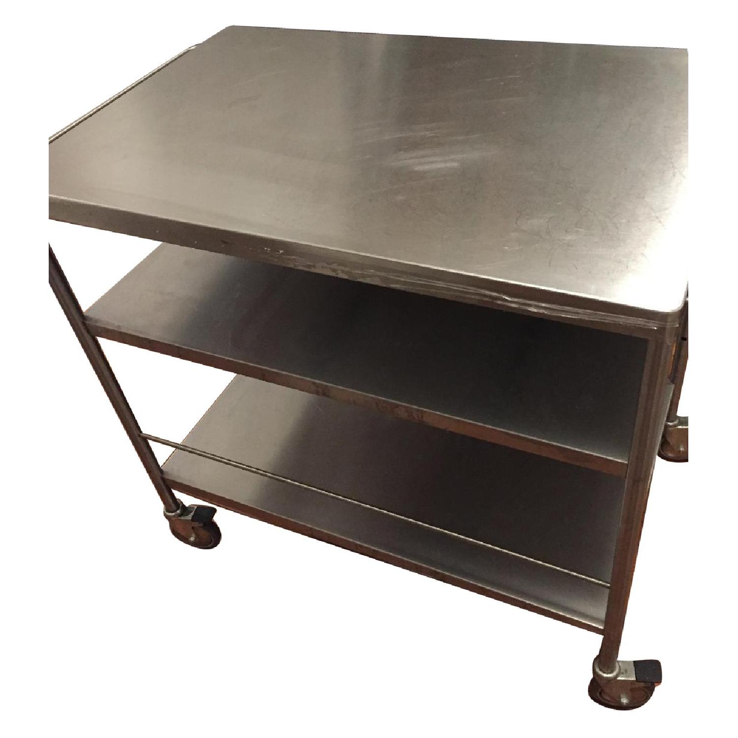 Seller's Notes:I am selling my beloved kitchen island, because I just don't have space for it in my new apartment. It's a 40 lb. dual extremely versatile kitchen island, kitchen table, cooking station, and work table. Honestly, I have used it for all of the above! Measurements: 34.5' length* x 32.5' width x 33.5' tall. *Length runs from either side of the counter top WITH towel rack: 38.5'. Measurements of each shelf: TOP: 9.5' tall. BOTTOM: 15' tall, which fits A LOT of storage: pots, pans, etc. Commercial stainless steel frame and counter throughout. Portable (with wheels, see photos). Two shelves underneath, which is perfect for a smaller kitchen, to stack pots and pans. Easy to use functionality. VERY durable, as I brought this bad boy up from my old apartment in Florida. Top of the cart can be removed for moving purposes, and squeeze past those small New York City hallway corners. Contact with any more questions!