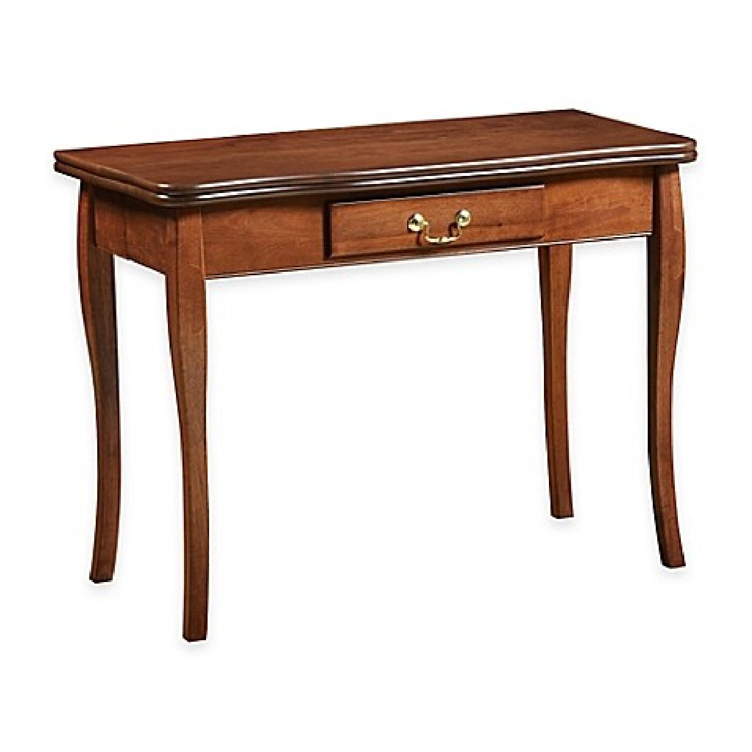 Seller's Notes:-Stakmore extension dining table -Used briefly Stakmore Traditional Expanding Table would make a great addition to small living spaces thanks to its elegant and convenient 3-in-1 convertible design Table starts out as a one-drawer console Transforms into a game table with a few simple steps Expands to create a dining table with the use of two additional 16" x 40" leaves (included) Shaped top and gently curving wood legs Hidden fifth leg provides extra support in the open dining position Crafted from solid hardwood Metal hardware Cherry wood finish Rubberwood construction Some assembly required (no tools needed) Console table configuration measures 20" D x 40" W x 30.37" H Game table configuration measures 40" D x 40" W x 29.62" H Dining table configuration measures 72" D x 40" W x 29.62" H