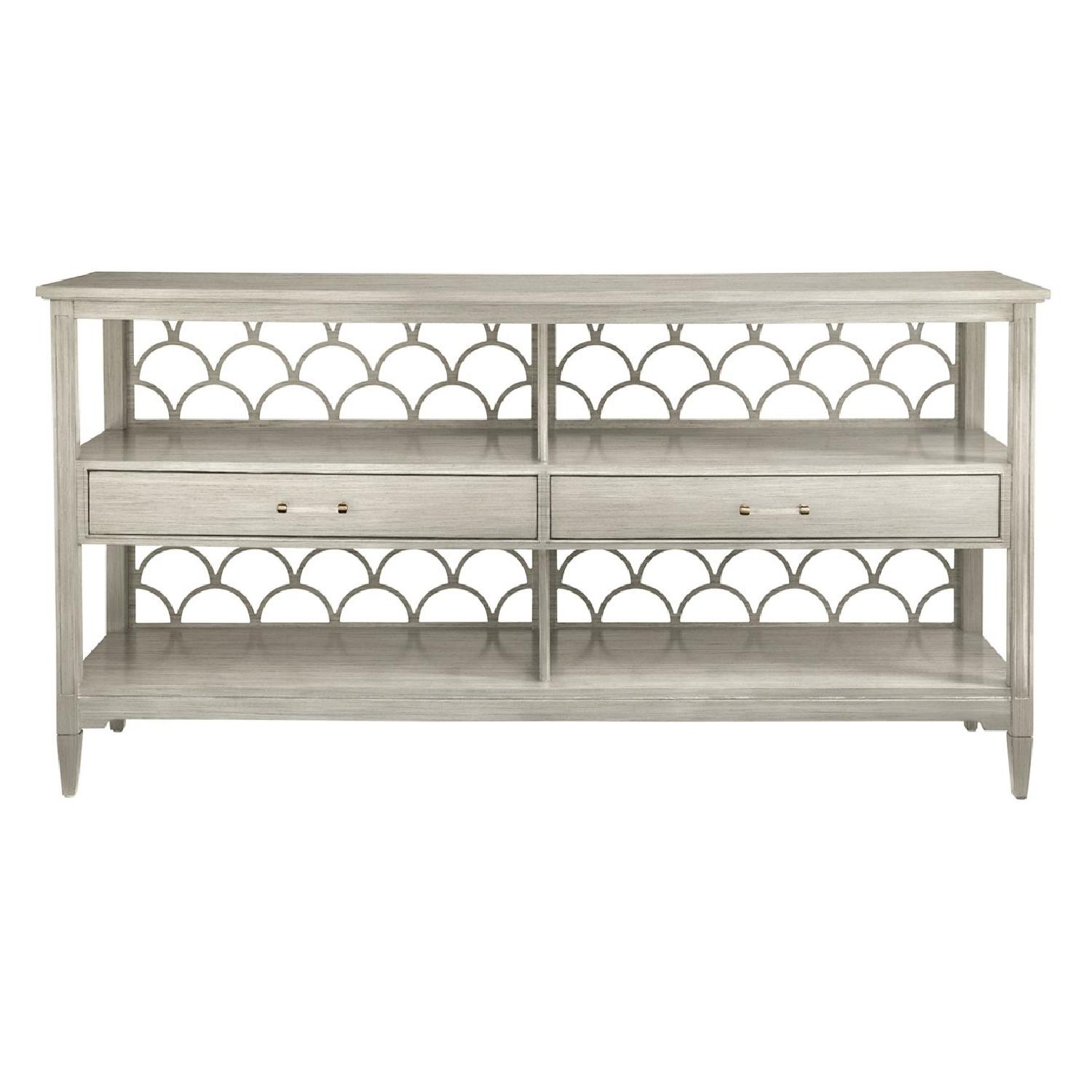 Seller's Notes:Coastal Living Oasis Collection of Stanley Furniture Midcentury coastal styling Oyster finish 2 Floating drawers Fixed bottom shelf Backed with a fish scale pattern motif Framed by hand-carved posts Utility for silverware storage Made from hardwood solids and Birch veneers