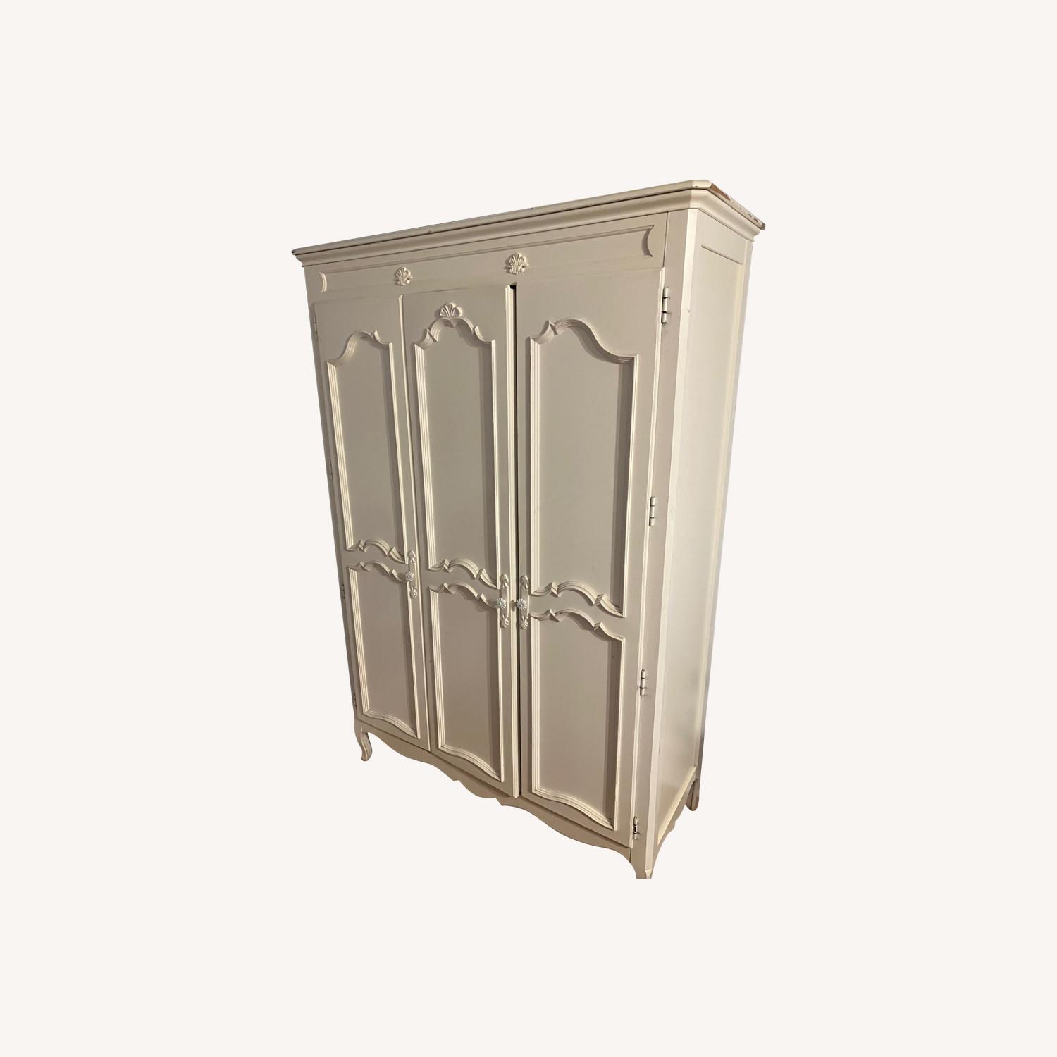 Seller's Notes:Stanley Young America Armoire From the "Ma Marie" collection -- Antique French provincial style. (Looks like RH "Bellina" style, at a fraction of the price.) Antique distressed white finish with original hardware. Versatile piece with shelves and space for hanging, can be used for clothing, linens, dining room / china cabinet, or as a media cabinet (cord holes in back). One internal drawer, mirror inside door. Paint/finish has some wear/scratches/damages, in line with the antique effect. Can be used as-is or refinished/repainted. Many years of life and utility left in this solid and beautiful piece of furniture! From a pet- and smoke- free home.