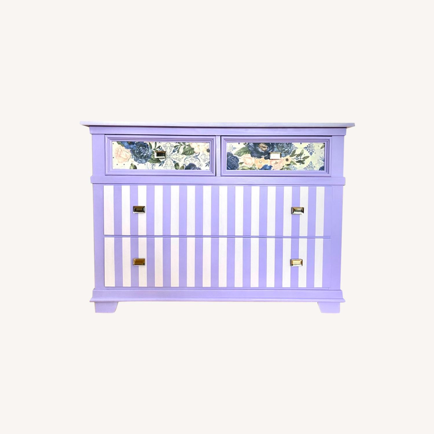 Seller's Notes:Professionally restored Stanley Furniture Company 4 drawer dresser. Chalk painted in shades of lavender with decoupage on the drawer fronts and stunning mirror knobs. White wax on the top surface for a unique effect. The entire piece has been sealed in waterproof sealer to maximize protection and durability.