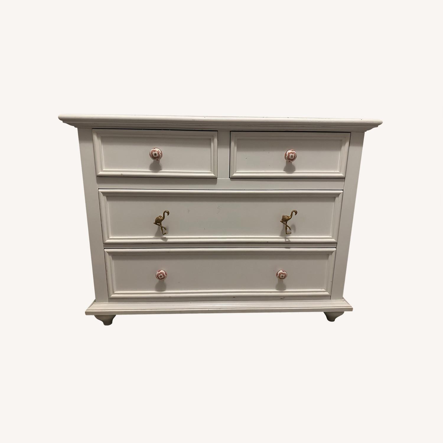 Seller's Notes:We've used this solid dresser for both our kiddos growing up! It's been great for their clothes, has a middle leg to inhibit tipping, and comes with a diaper changing tray on top (see additional pic). We're selling it because we moving.