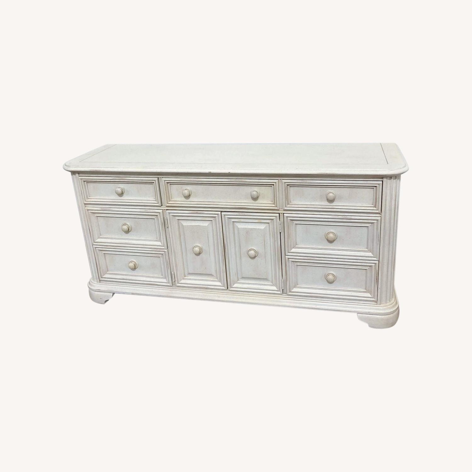 Seller's Notes:Description: 7 drawer with doored storage. White-wash finish. . Brand: Stanley Furniture. Material: wood. Gently used - any blemishes or damage will be included in the photos. #SKU: 2012908. Tags: transitional,wood