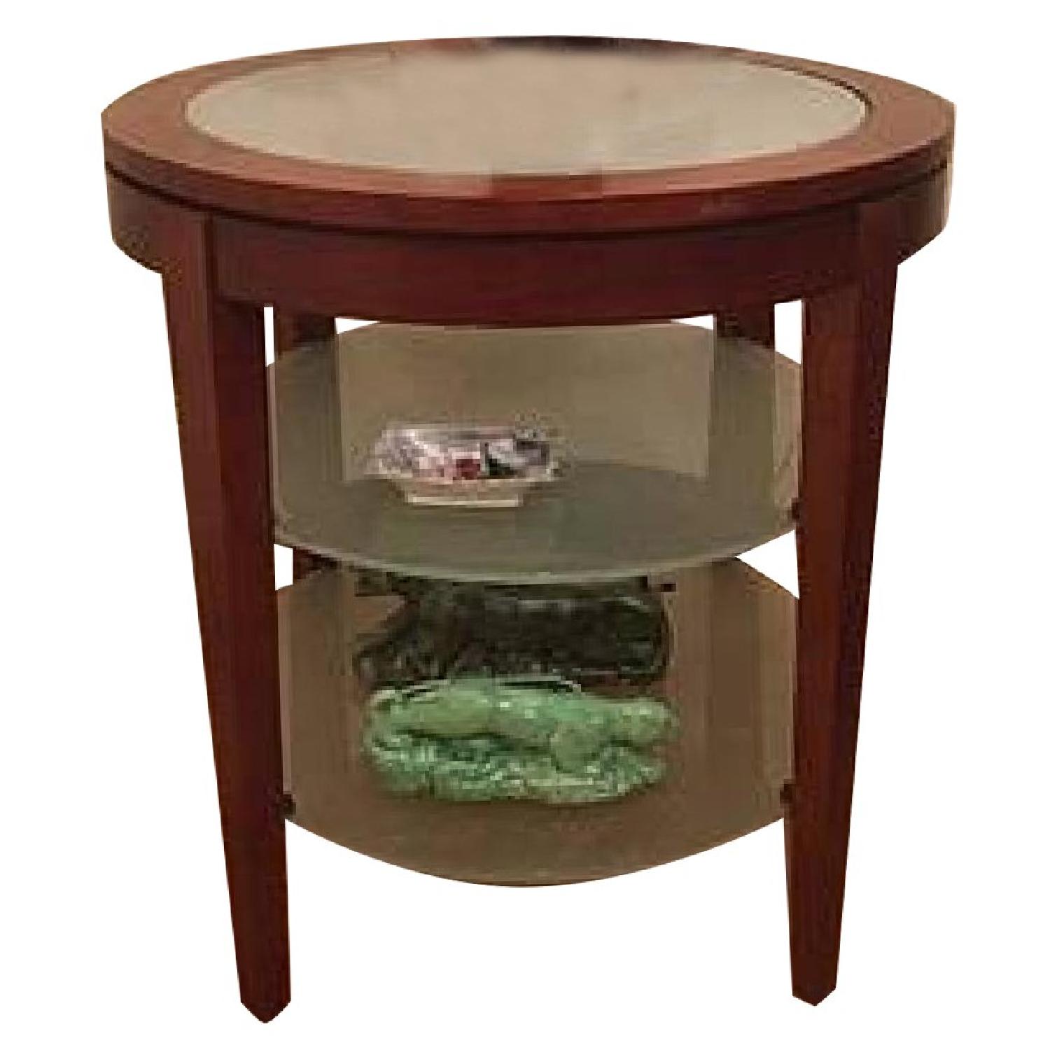 Seller's Notes:Round End Table By Stanley Smoke glass inset top with one smoke glass shelf See our other listings - Matches coffee table, entertainment console, bookcase and coffee table on sale. Dimensions: 26" wide x 26" deep x 24" high