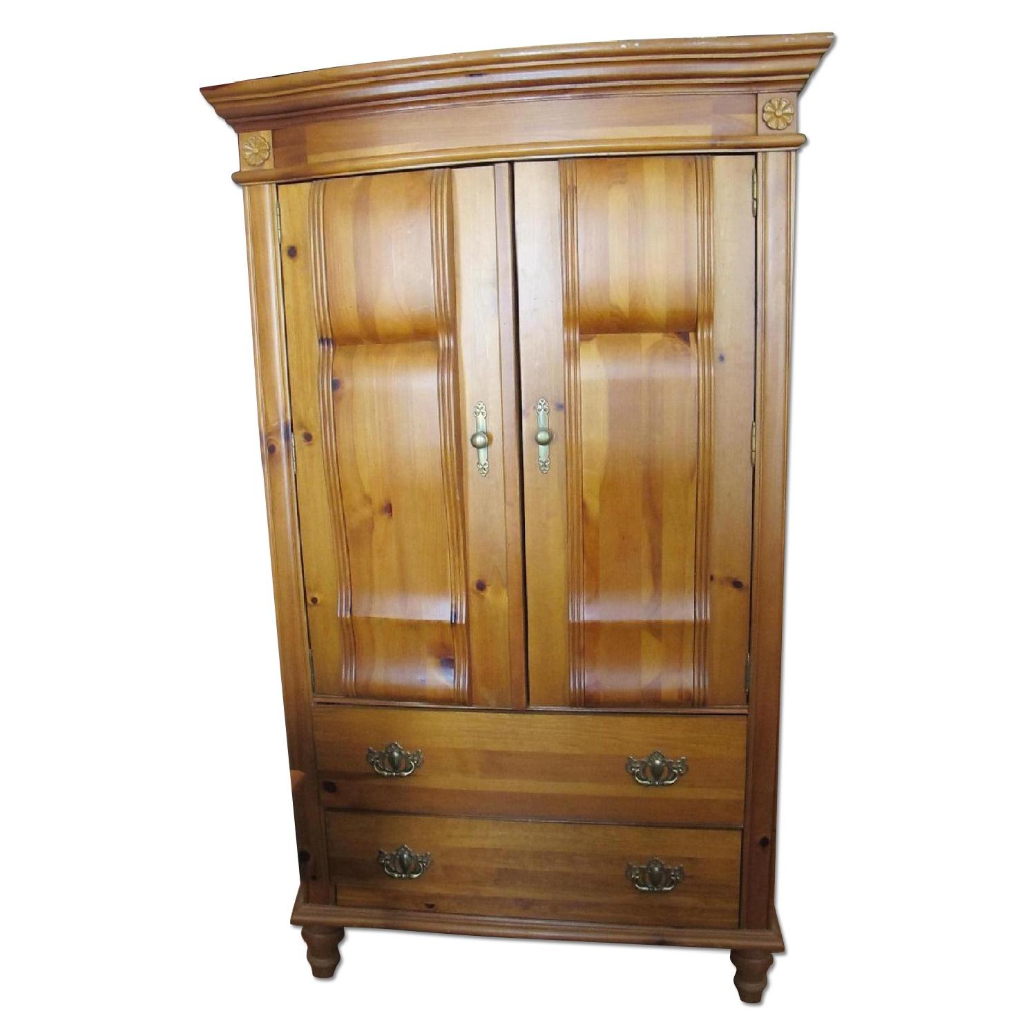 Seller's Notes:Gorgeous carved solid pine wardrobe. Solidly built with 3 shelves. Optional clothing rod to hang clothing.