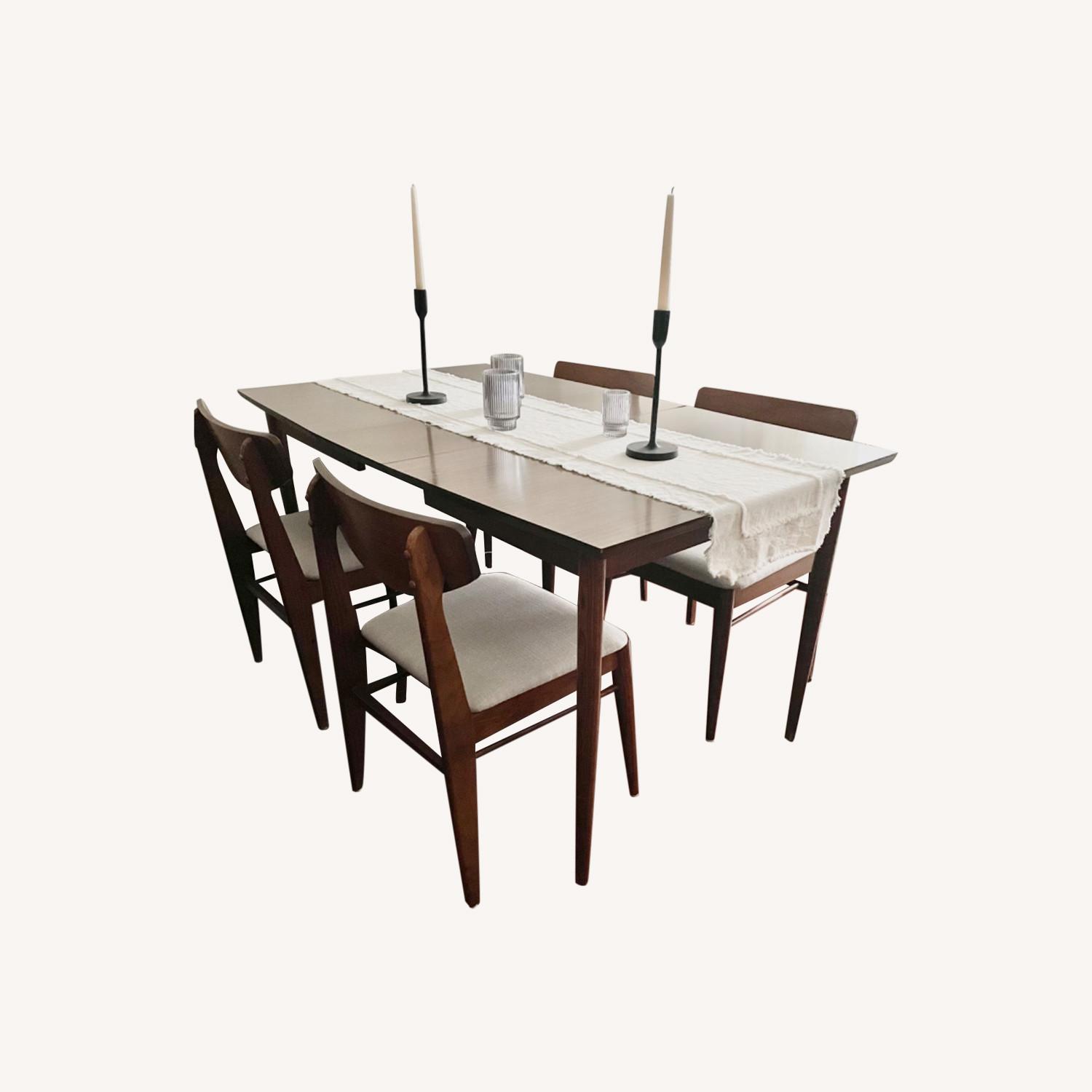 Seller's Notes:Stanley Furniture original mid-century dining table set, including table and 4 chairs. Beautiful piece we loved having in our home. Manufactured in the 1960s by Stanley Furniture. Built in 12 inch leaf flips out of table when pulled open, expanding table from 60 to 72 inches wide. The chairs have a stylish shaped backrest, with nice wide padded seats making them both chic and comfortable. The set consists of 4 side chairs, which were recently professionally reenforced and reupholstered. Excellent vintage condition with age appropriate wear. Some minor edge wear on the leaf (see photo). Measures: Table: 59.5 long x 40 deep x 29.5 high and the leaf adds 12 inches to the table for a total maximum length of 71.5 inches. Armless chairs: 32 total H x 18.5 seat H x 19 W x 17 D inches.