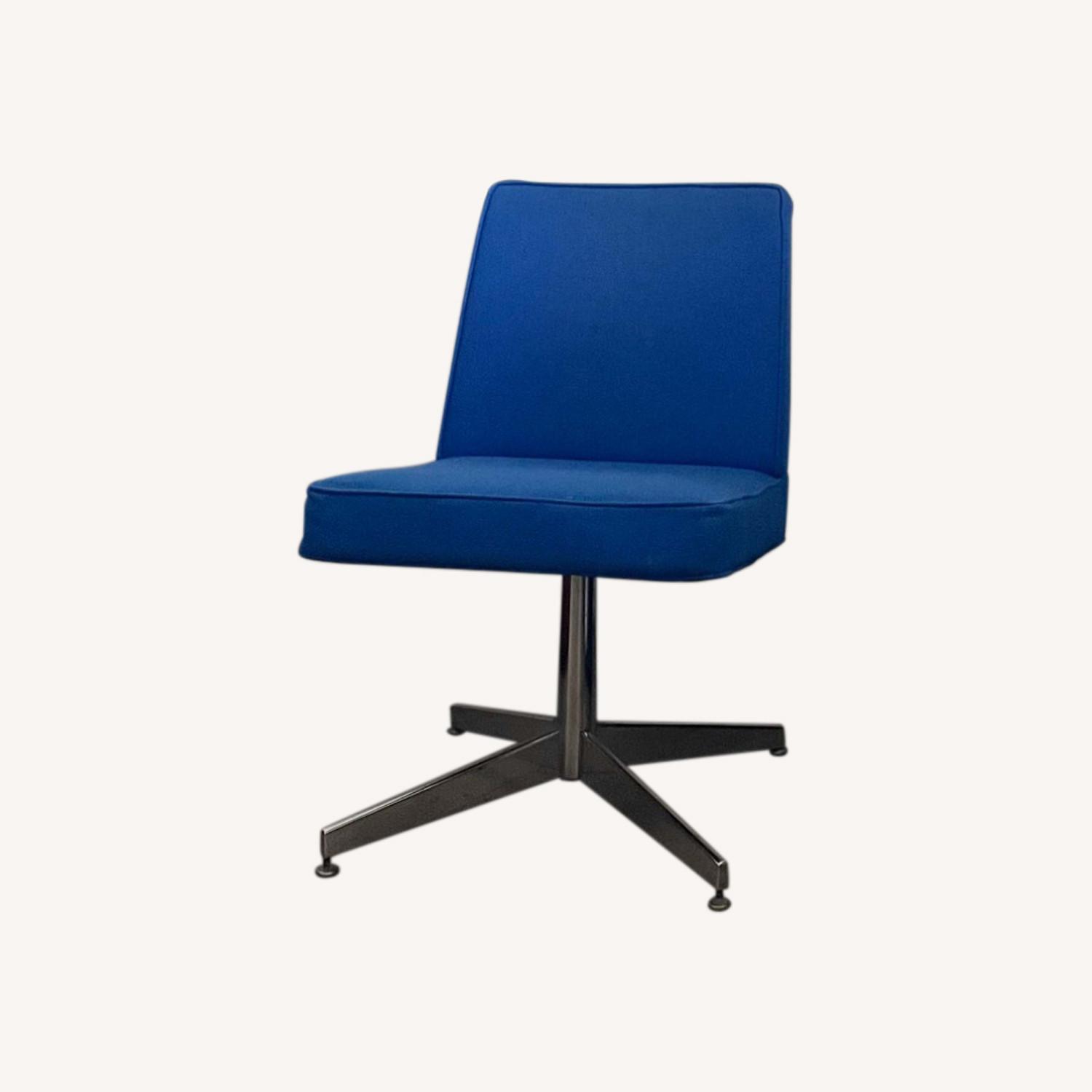 Seller's Notes:Authentic, 1970's MCM Steelcase accent chair. Bold cobalt blue. The design is accentuated with piping along seams. No fading, rips, stains, pilling in upholstery. Chrome plated four star legs. Sturdy. Each leg has adjustable feet. Wide enough to sit cross legged, slightly angled back for sitting executive style, and overall firm seating. Does not sag. Wear consistent with vintage age and use.
