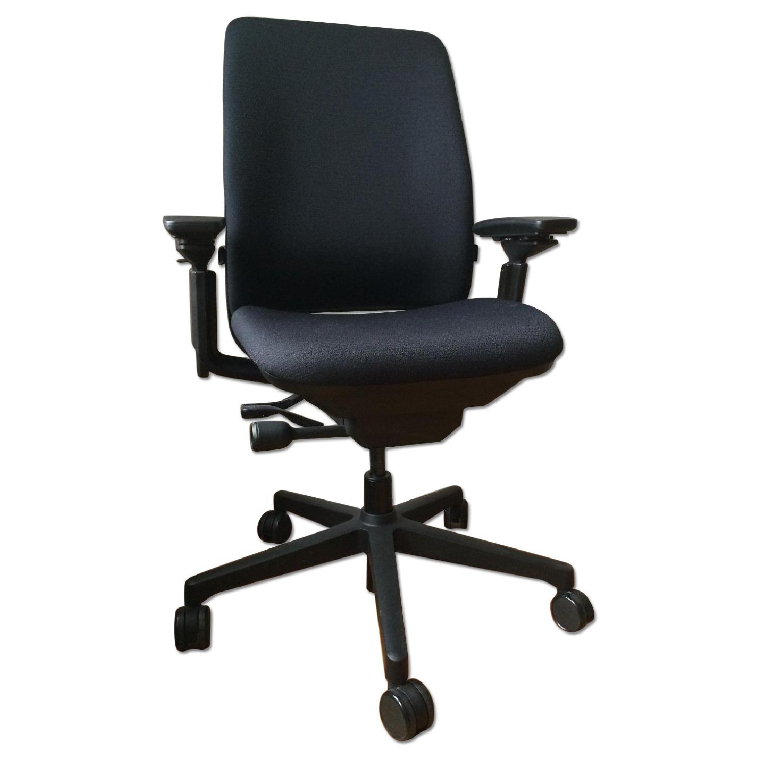 Seller's Notes:Black finish with black Steelcase "Standard" fabric upholstery Adjustable arms and seat height LiveLumbar technology back support and resistance For various details about all the moving parts of this chair, and bc of the limit on # of characters in this Description, see: http://www.steelcase.com/en/products/category/seating/task/amia/pages/overview.aspx 1. There are 5 casters, each with 2 wheels. One caster is missing one of its 2 wheels. This has no impact on the experience using the chair. 2. Penny-size blemish on seat fabric.