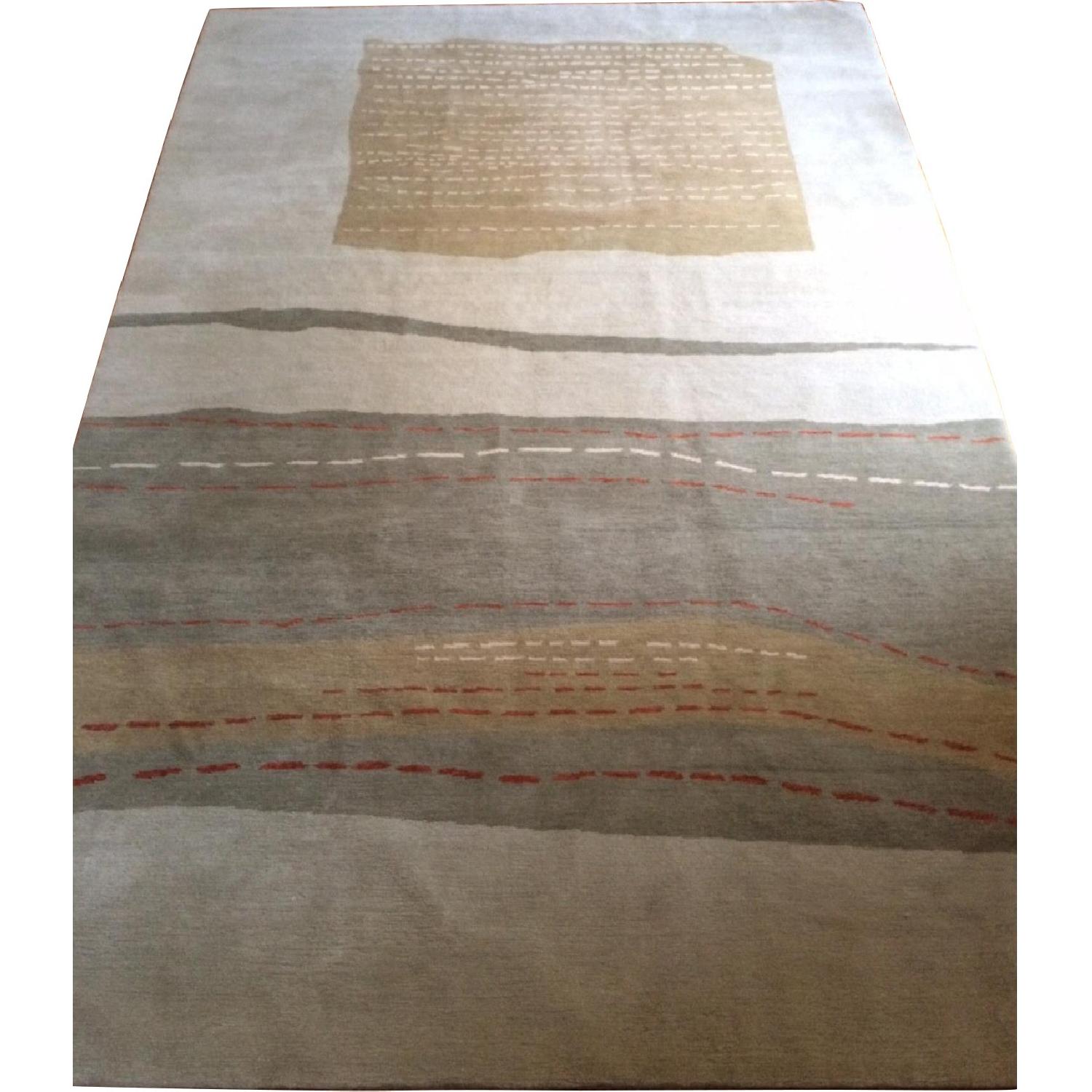 Seller's Notes:This 100% wool hand-knotted Tibetan rug by Stephanie Odegard is called Tabito. The motif is modern, and somewhat geometric with an organic quality. Colors are soft grey-greens, tan with cream and warm red accents. Size is 6' x 9'1".