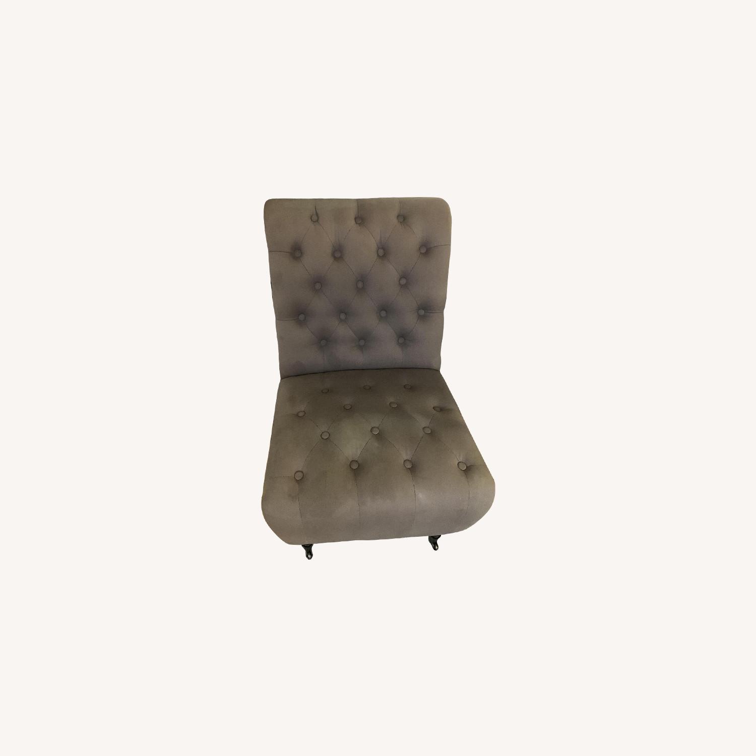 Seller's Notes:Armless tufted side chair in dark grey linen on espresso wood legs w/ front casters. Structure is in excellent condition No wear and tear at all other than needing a shampoo