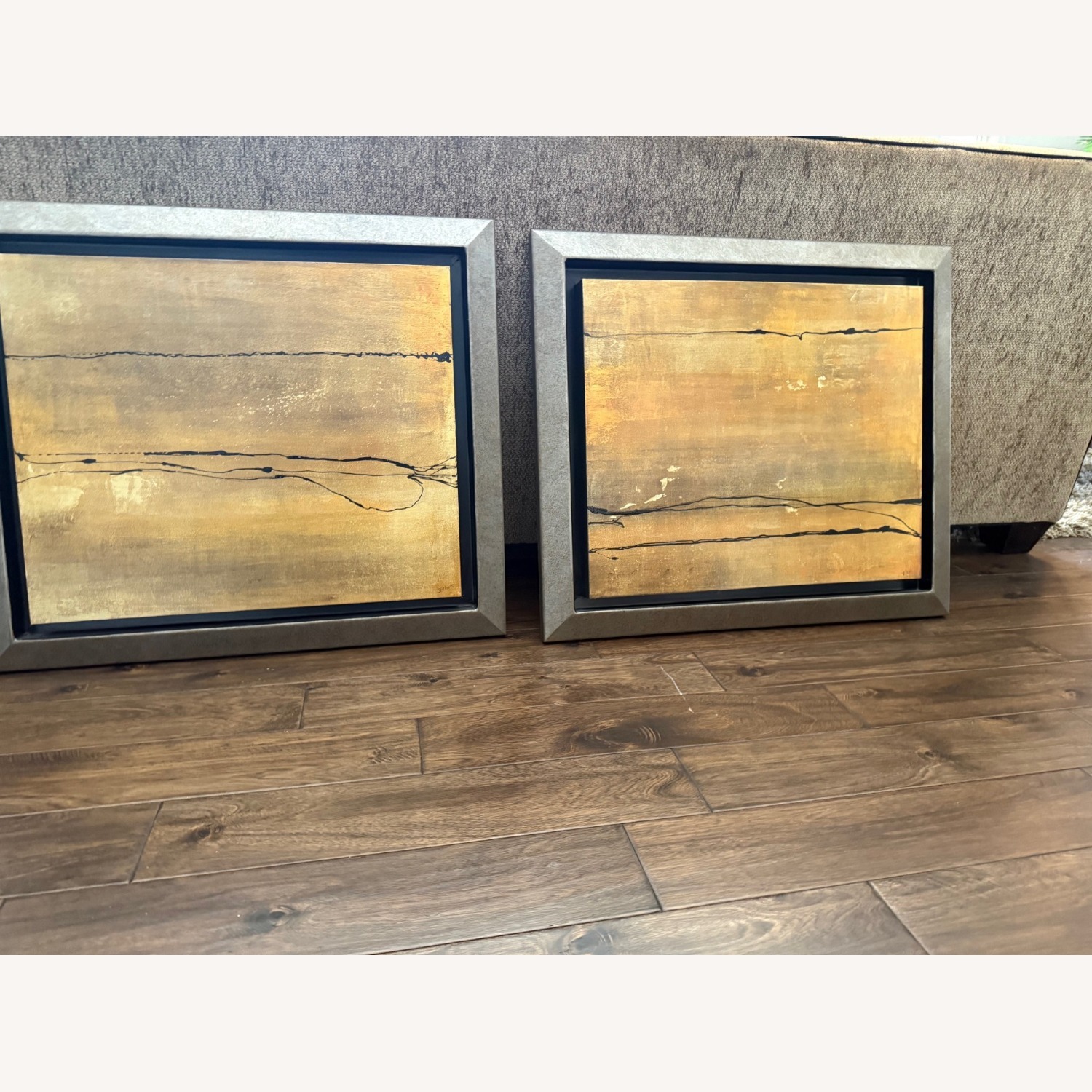 Seller's Notes:Description: Original abstract paintings by James Elliot, professionally framed in substantial metal frames. These are one-of-a-kind, hand-painted works on canvas, not prints or reproductions. Warm gold, earth, and neutral tones with expressive linear detail make these pieces ideal for modern, contemporary, or transitional interiors. They work beautifully as a pair or can stand alone. ✔ Original artwork on canvas ✔ Signed by the artist ✔ Heavy, high-quality metal frames included ✔ Purchased through Phoenix Art Group (documentation included) ✔ Excellent condition Perfect for a living room, office, entryway, or over a console or sofa.