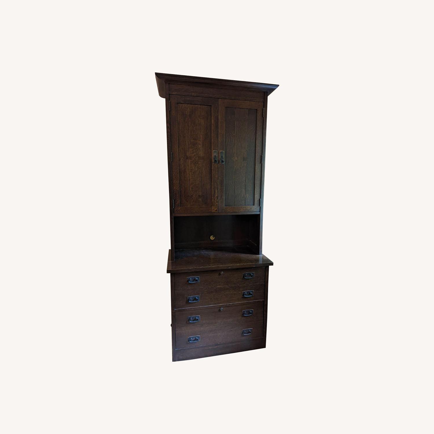 Seller's Notes:This is a great sized piece for a small living space! Offering a vintage authentic Stickley Mission Collection Oak bookcase or bookshelf with two lateral file drawers below. Designed to look like 4 individual drawers - this is a very handsome and useful Stickley piece that has a slim profile and is in two parts so very easy to transport. The two drawers can be used for anything other than files by just lifting out the file rack. Upper bookcase offers three levels of shelving plus you have a surface area with cut-out for electronics. Dimensions: 34.75" wide, bottom is 19" deep and top 12" deep. Bottom cabinet height is 29 1/2" and top 52 1/8". Condition is excellent (excuse the visible dust on surface) and from a pristine home that is smoke and pet free.
