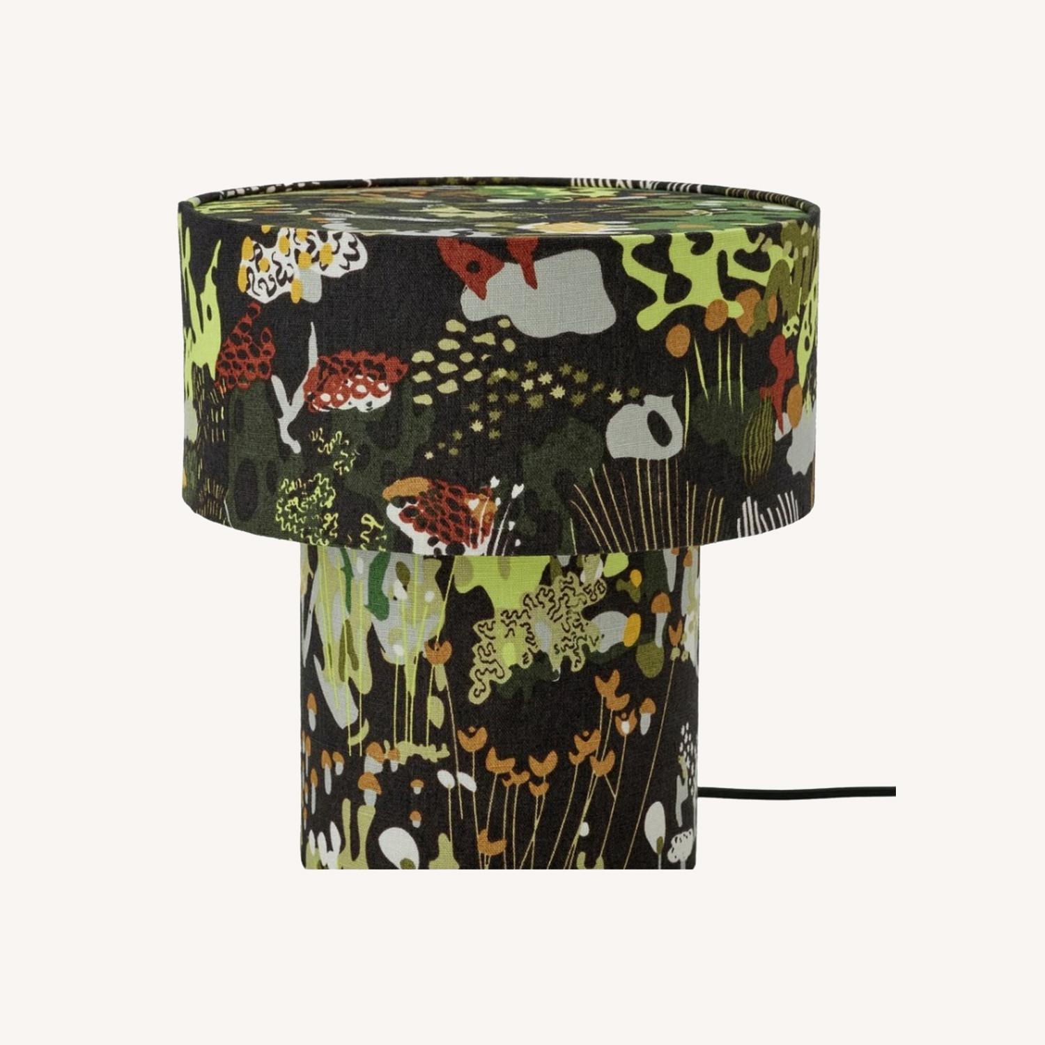 Seller's Notes:This table lamp is guaranteed to be an eye-catcher in the room. Covered in a fabric made of 100% linen and with a lively, nature-inspired pattern that takes you to the fairytale forests of the far north.