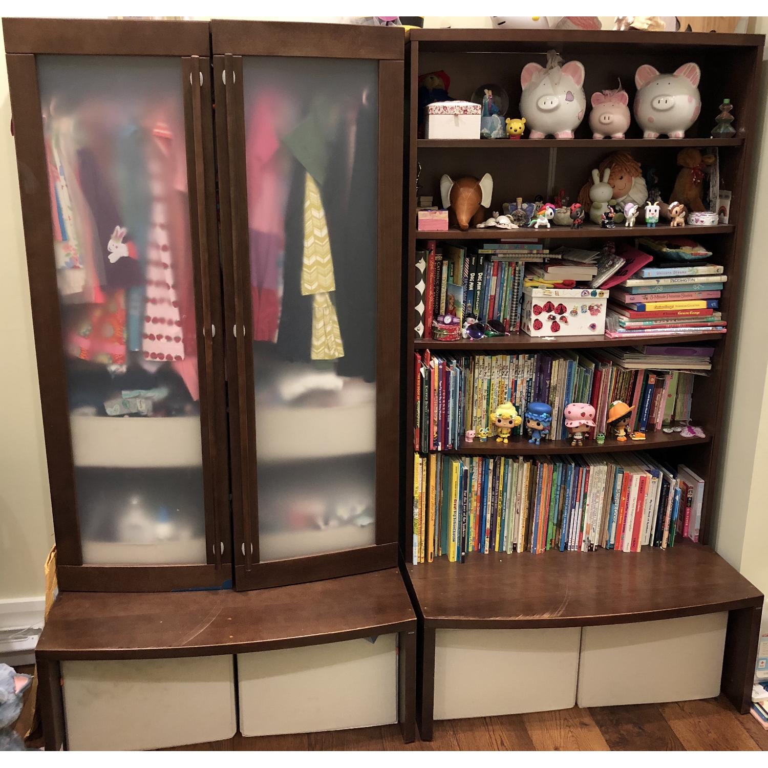 Seller's Notes:Includes armoire with two doors and bookcase in walnut Includes 4 under unit baskets in natural white with some wear and discoloration (can likely be cleaned with magic eraser); also includes 4 additional matching baskets for armor in very good shape. Armoire holds hanging and folded clothes Bookshelf can hold a good amount of things. Nice thick shelves. Some scratches on unit where doors or armoire open and on bottom shelf of bookshelf Unit Complete Dimensions: 69.3" H x 70.8" W x 23.6" D Unit can be configured in different layouts good for small spaces Armoire and bookshelf current retail $999 (paid over $1500) baskets $20 each 8 in total $160 retail