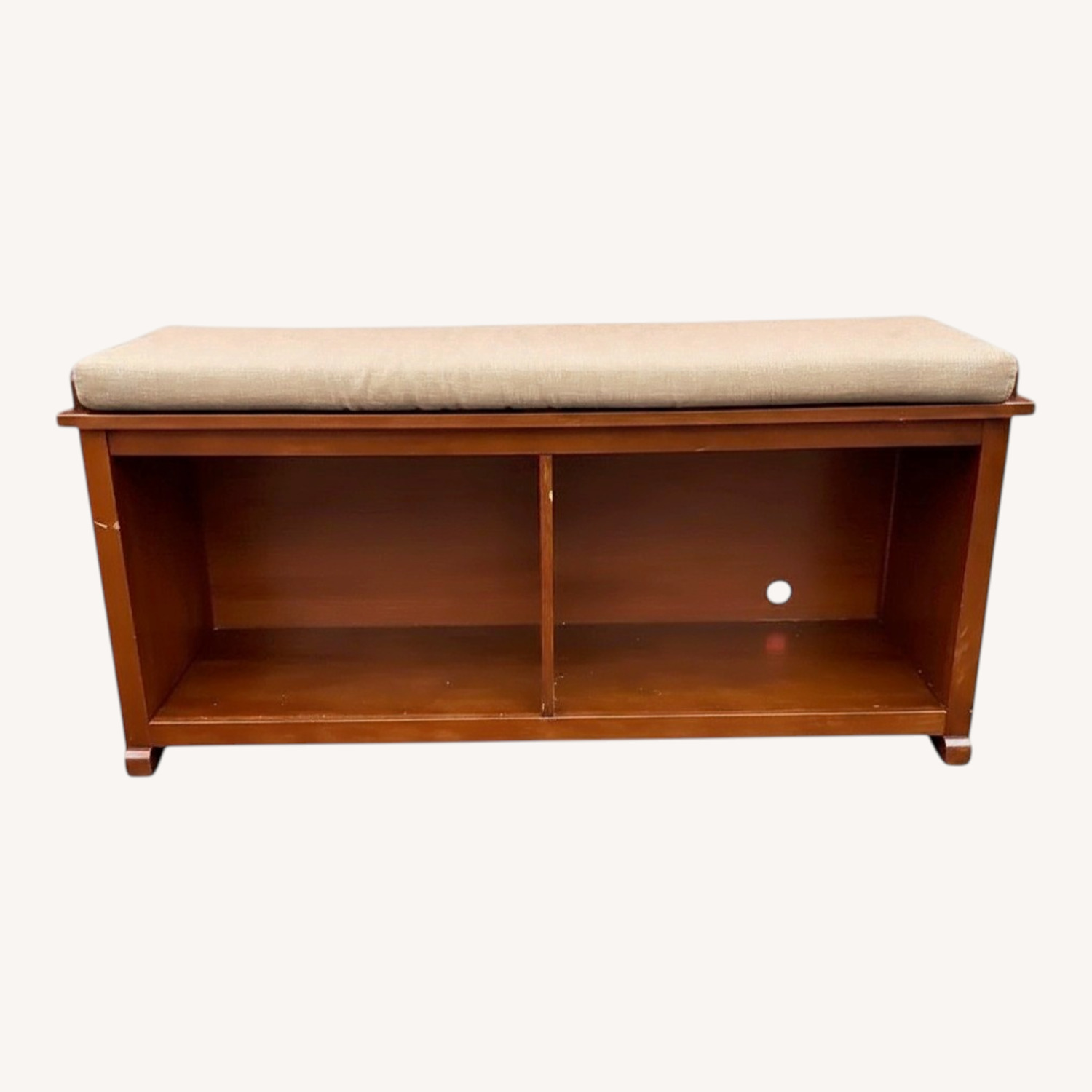 Seller's Notes:This wood bench has an open bottom to store shoes and a nice padded seat to sit down to take your shoes off when you come in the entry or the mudroom. In good condition, a few minor marks can be filled in with polish. 22”H x 47.5”W x 16”D Our pieces are vintage, antique, or previously owned furniture and decor. As such, they often show signs of age, use, or character—which we believe adds to their unique charm. We make every effort to describe items accurately and provide clear, detailed photos, but we encourage all buyers to review the images carefully and ask questions prior to purchase if you need further clarification. Beauty and condition can be subjective, and while we strive to highlight both the strengths and any notable flaws, perfection isn’t always guaranteed with older or pre-loved item.