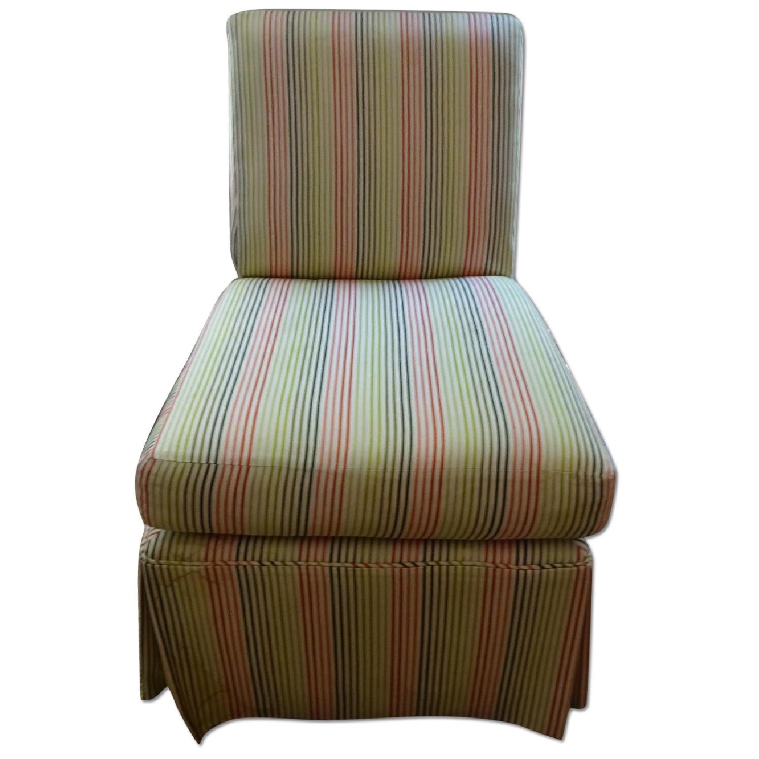Seller's Notes:Stripped high back slipper chair - this great armless accent chair can be used in a bedroom or a living room and the fabric complements many colors. Some stains on the fabric, see photos. 23" seat depth 19" seat height If you are interested in purchasing multiple items, please contact support to see if combined shipping is available.