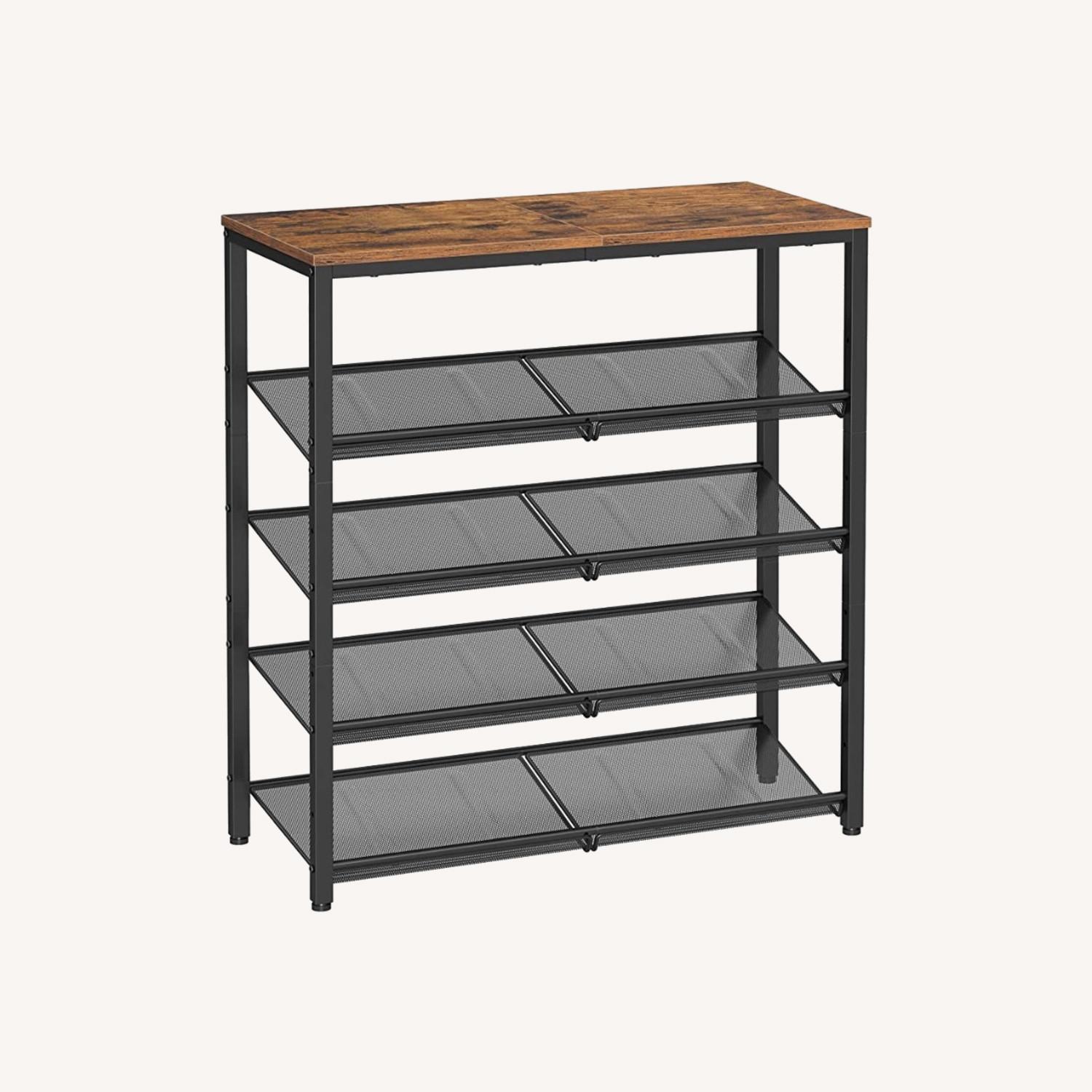 Seller's Notes:GREAT QUALITY Sturdy 5 tier shoe rack can hold 20-25 pairs of shoes. Product dimensions: 11.8”D x 29.5”W x 36.6”H Free standing, made of black coloured steel and rustic brown engineered wood. Distance between each of the 4 mesh shelves is 8”, each shelf having a load capacity of 24.2 lb. Each shelf can be placed flat or angled. Top shelf has a load capacity of 59.4 lb.