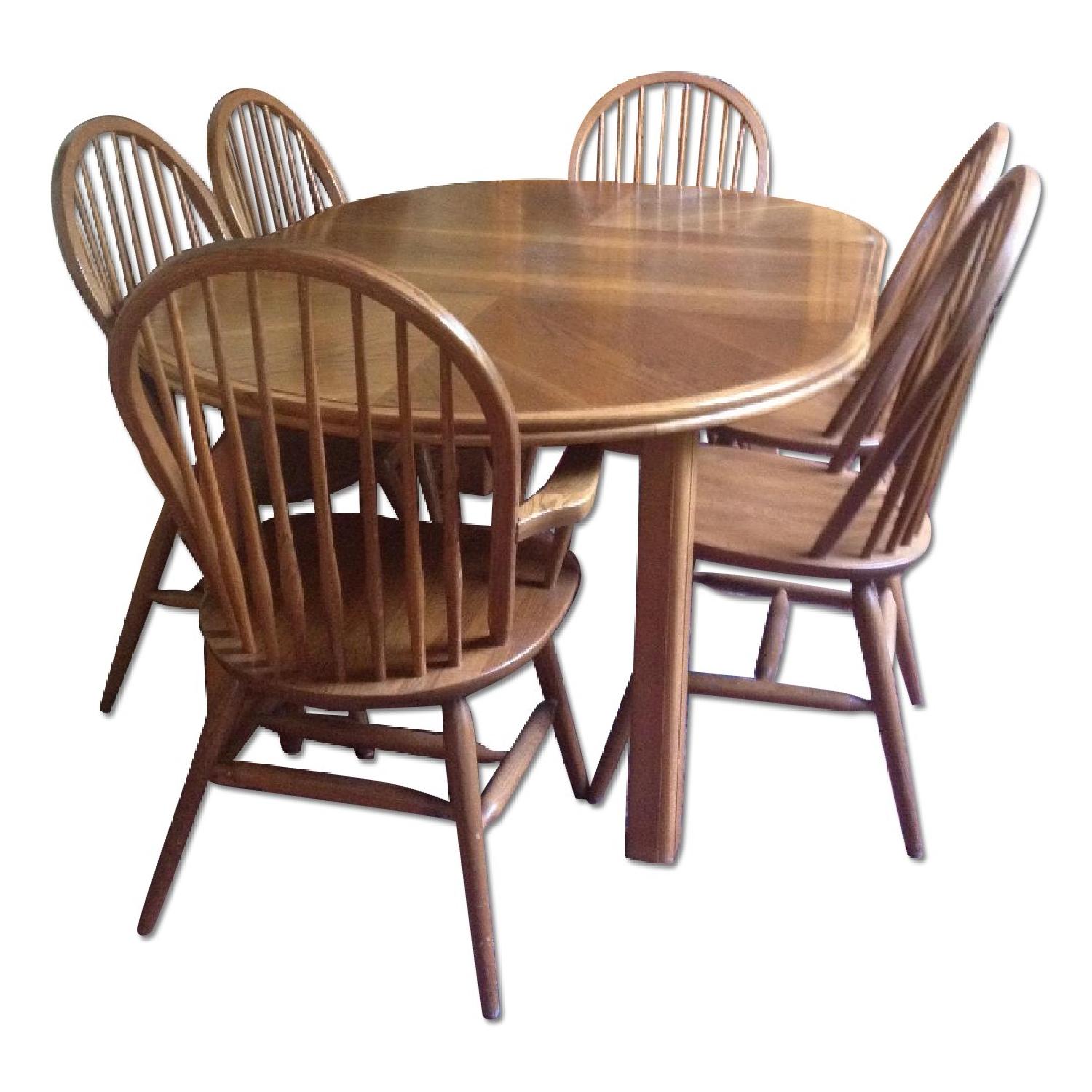 Seller's Notes:For your consideration is a sturdy oak dining table with an extension leaf (70" long with leaf and 46" round without a leaf) with 6 matching oak windsor chairs (2 with arms and 4 side chairs). It has been under a good care with one owner since purchased in the early 90's, made in Yugoslavia. Usual wear and tear but many good years left. The table top is oak veneer (other parts are solid oak), therefore, slight peel-offs observed on a few spots on the edge of the table top (see photos). Chairs are solid oak and their height of the back is 38 1/2", seat height is 17 1/2", and height of the arms is 26". Sizes of the seat is 18"x19 1/2" for arm chairs, and 17"x17 1/2 for side chairs. The red felt cover for a table leaf storage is included in this sale. Please check out the storage section, as we are selling the china cabinet in the background in the photo. Best offer is welcome. If any question, please email auctionwine@gmail.com.