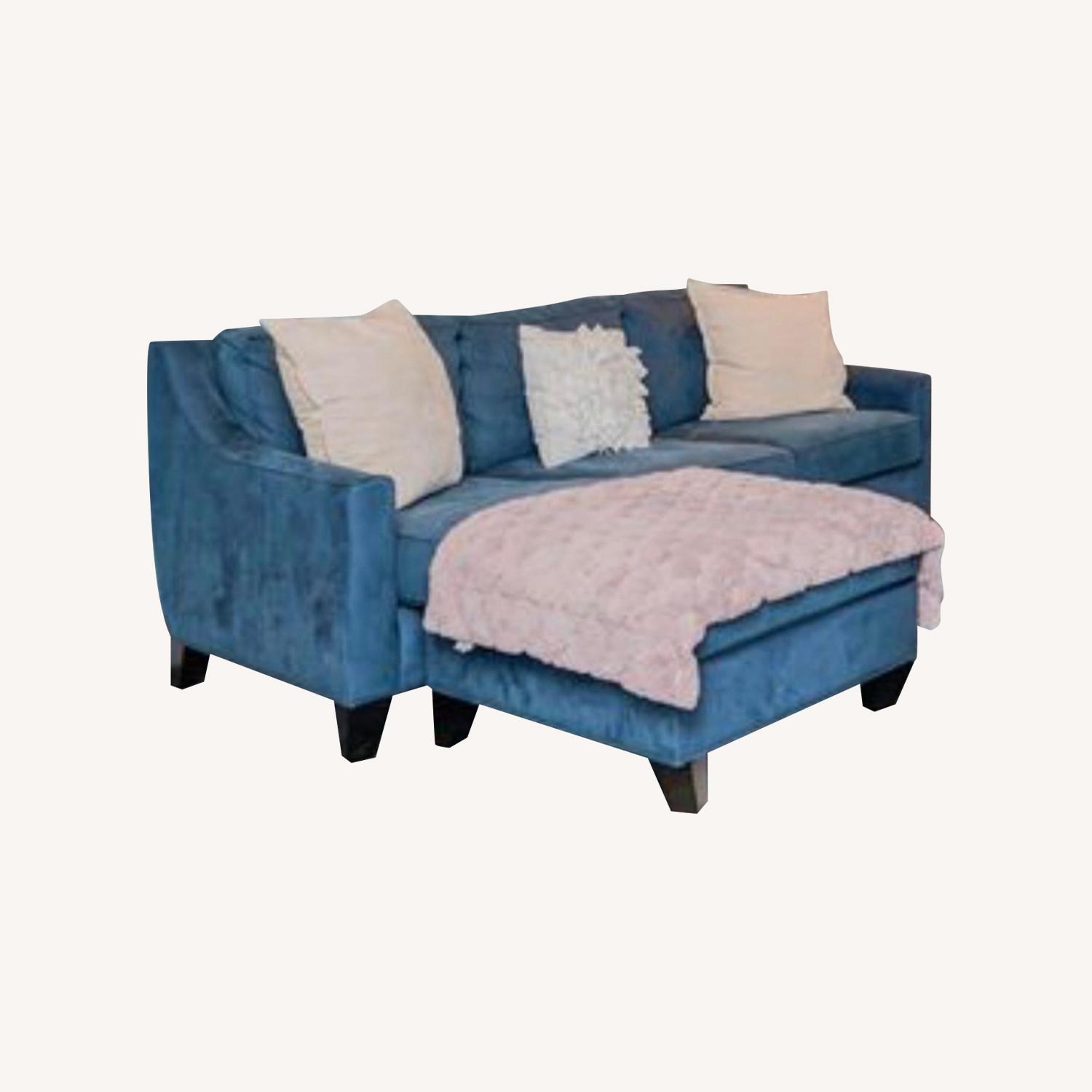 Stylish Blue Sofa Behind Ottoman