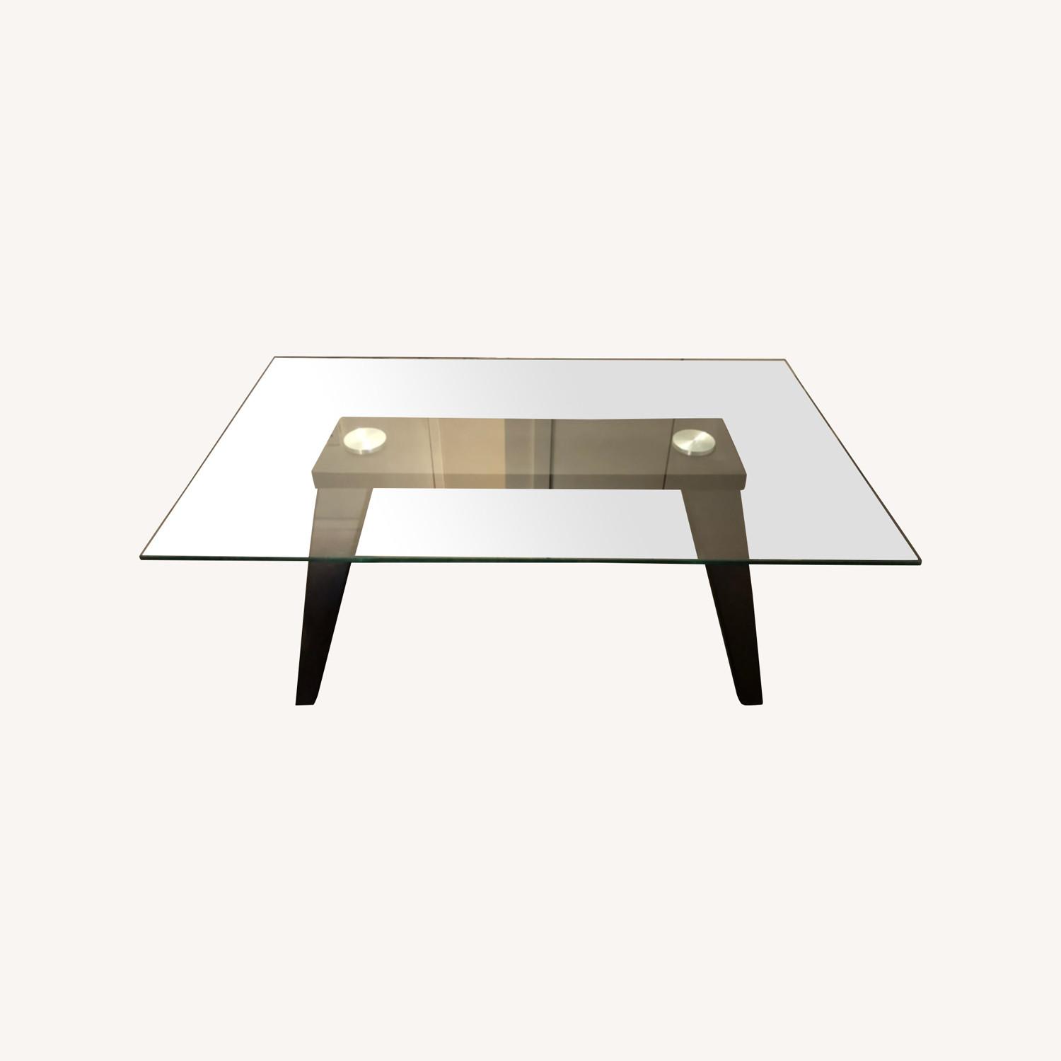 Seller's Notes:Solid, modern, nice sized coffee table. Dark espresso solid wood base, glass top table. Dimensions (approximate): 47" long, 27.5" wide, 18" high. Light scratches on glass.