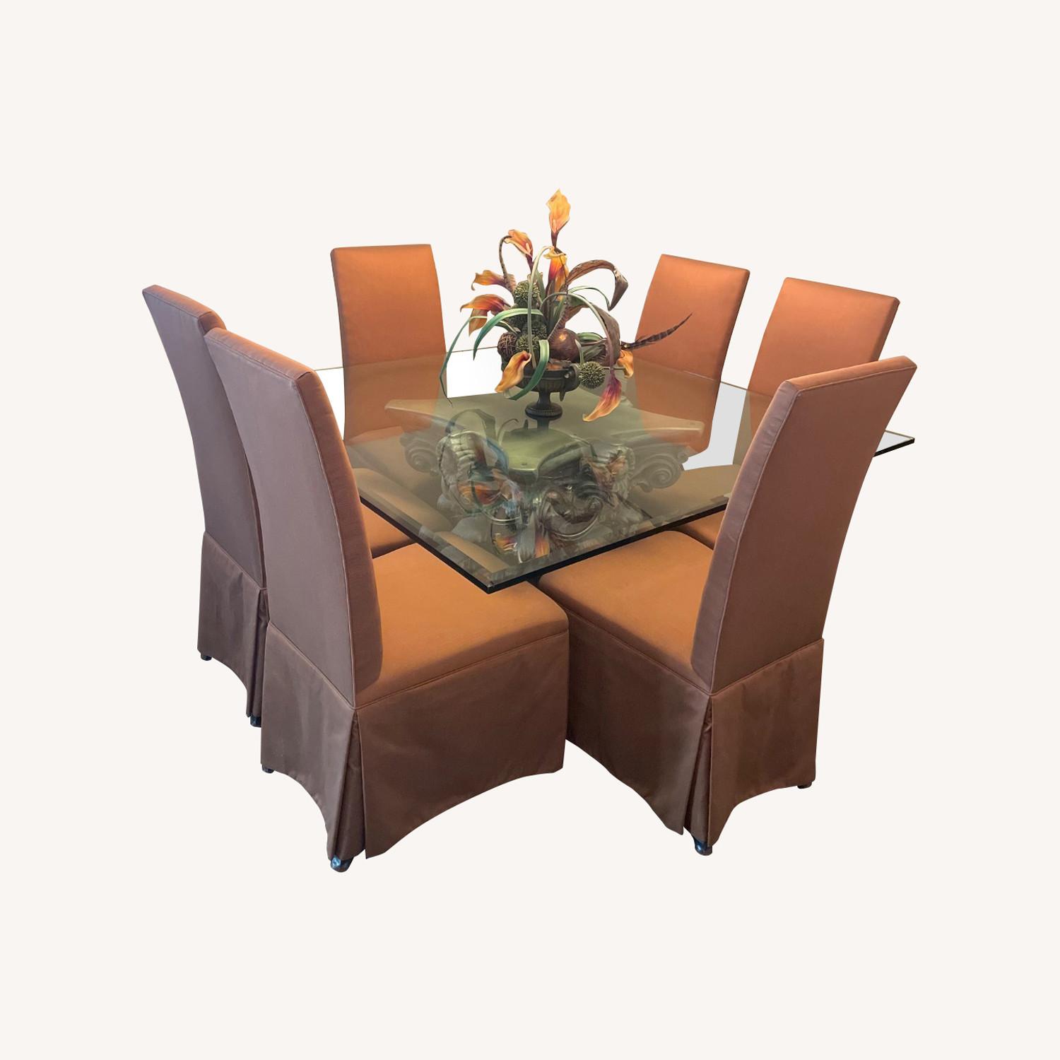 Seller's Notes:Swaim designer dining room set w/60” square glass top that is 2” thick with beveled edges, a decorative ceramic base and 6 Swaim silk chairs in a rust color