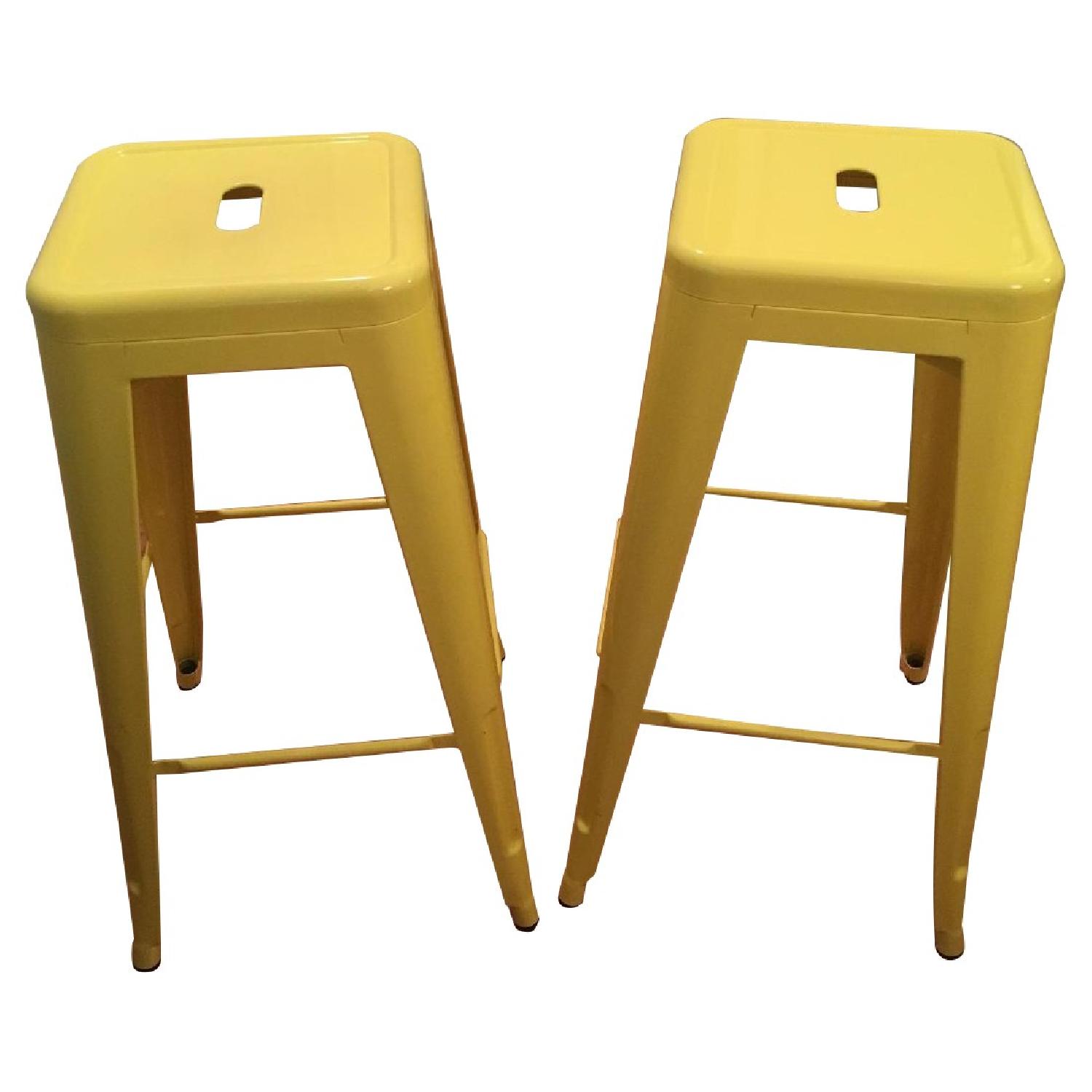 Seller's Notes:Stools no longer work with my decor, so need to sell. For a unique, contemporary touch in your home bar or at the kitchen counter, try out these modern bar stools. This set of two steel bar stools is sturdy enough for regular evening meals, and a convenient hand hold cut into the center of the seat makes moving these durable chairs around the home easy. These modern barstools feature a powder-coated design to ensure long-lasting beauty while remaining easy to clean. The generous 12-inch square seats feature a convenient hand hold in the center to ensure easy manipulation. This contemporary industrial-inspired design is available in a two-piece set, so you can create a cohesive decor. Set includes: Two (2) stools Materials: 100-percent steel Finish: Lemon yellow Powder-coated Non-mar foot glides Stackable for space saving storage Convenient hand hold in seating area Seat dimensions: 30 inches high x 12 inches wide x 12 inches deep Dimensions: 30 inches high x 17 inches wide x 17 inches deep Country of Origin: China