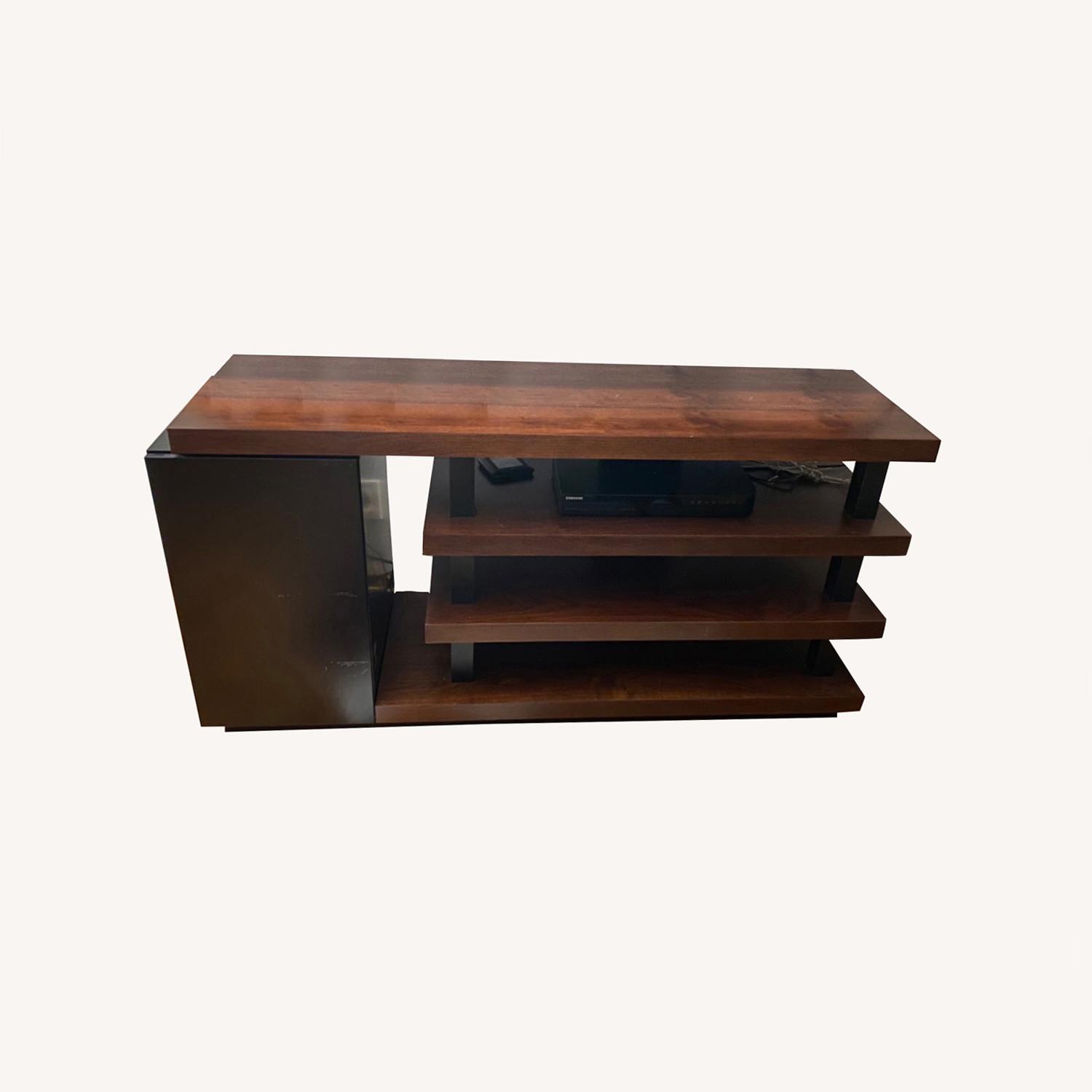 Seller's Notes:Tampa TV stand in 60” total length, 18” depth, & 30” height. It has three open shelves rows underneath for securing things and a 2 tiered storage cabinet on the left side, with a black handle-less door. It can be used as a entryway console too as it is not too deep. It has scotch tape smudge on the front door that can be remove, because we taped the door so it wont opened during the moving. And it has a 2-3mm scratch that is barely visile in the front left. All these are attached for pictures.