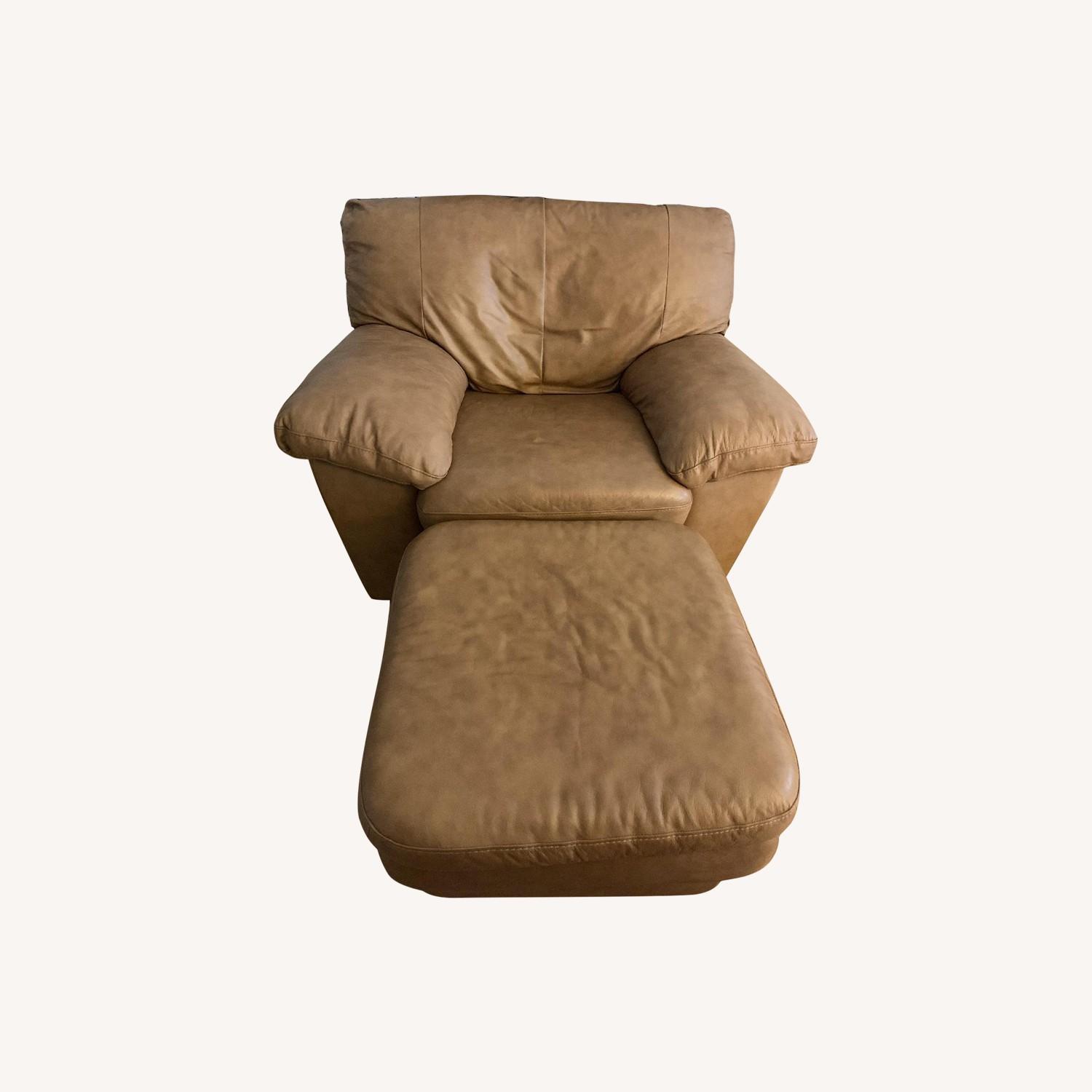 Seller's Notes:Oversized leather chair in good condition, with ottoman included (ottoman has wheels). Very soft and comfy. No visible damage. Priced to move quickly, need space right away!