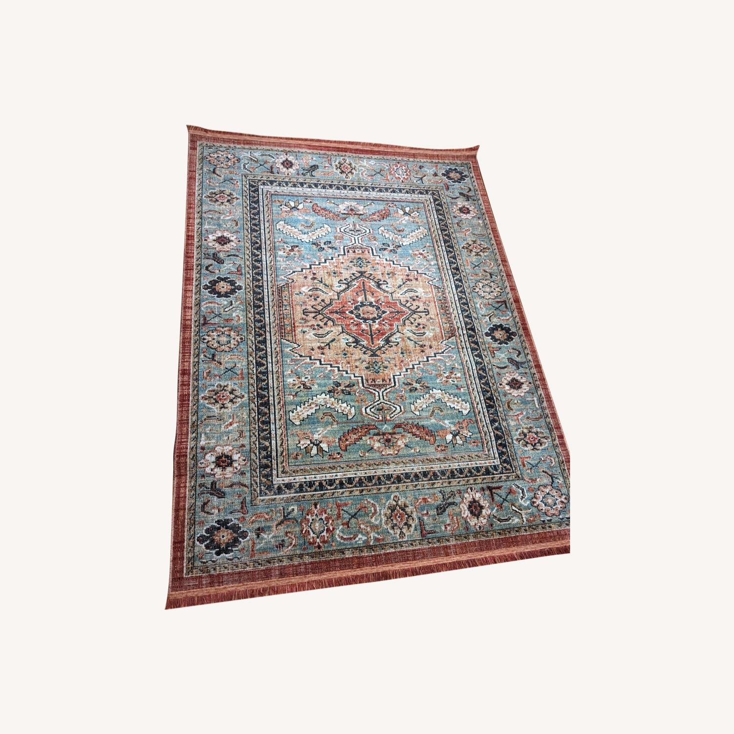 Seller's Notes:- 5x7 area rug with fringe - mostly a burnt orange and light blue-green with other colors mixed in - from Target - great rug that just doesn't work in my space - barely used and never walk on with outdoor shoes. in a pet-free and smoke-free apartment