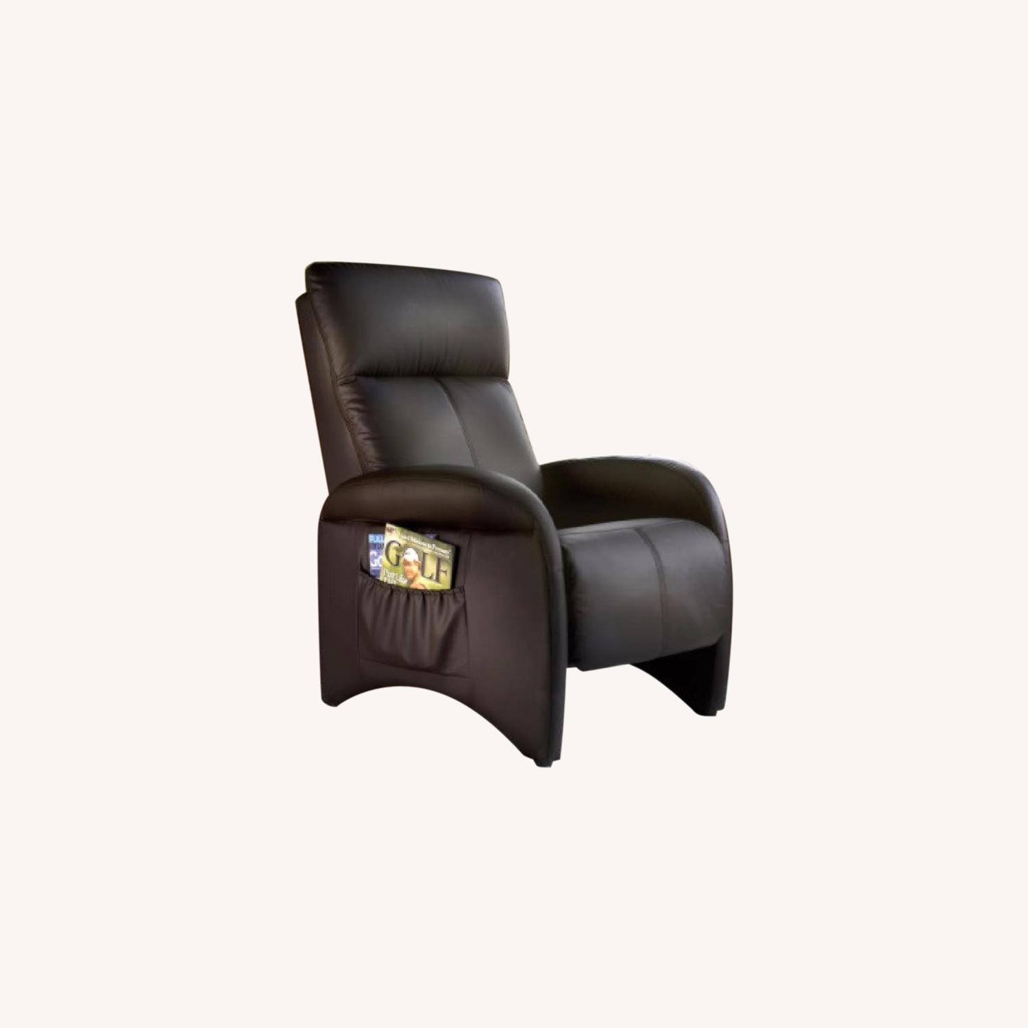 Seller's Notes:Used for less than 1 year. Would keep if not moving. Dogs are in the apartment, but never on the chair. Upholstered in a soft faux leather, this supportive recliner features padded cushions and headrest, a reclining foot rest along with a side pocket for storage.