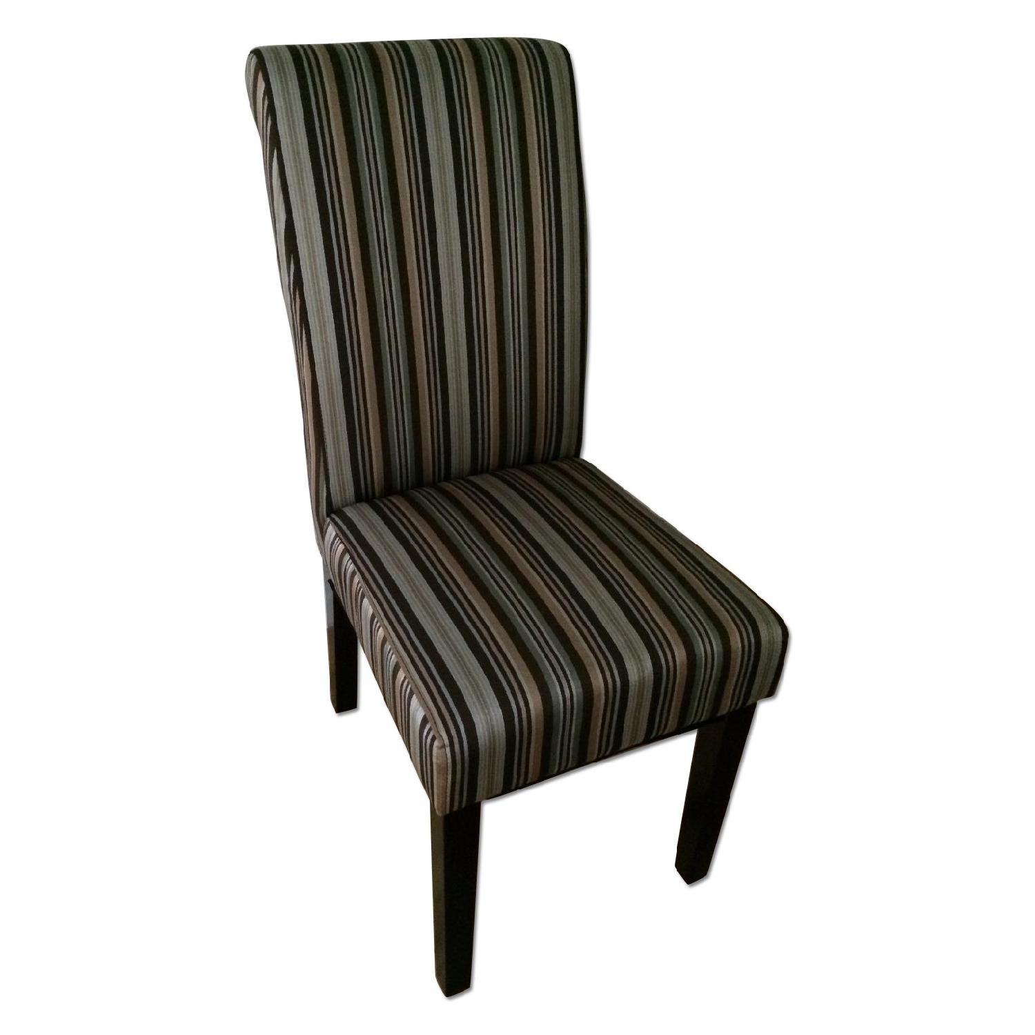 Seller's Notes:Set of two chairs from Target's Avington collection. The two chairs were part of my dining set (all of which is for sale for $350) Features: Curved Back, High Back, Armless, Floor Protectors, Padded seat, Padded back Frame Material: Hardwood Furniture Legs Material: Wood Wood Finish: Espresso Textile Material: 100 % Cotton Fill Material: 88 % Polyurethane Foam, 12 % Polyester Fiber Maximum Weight Capacity: 300.0 Lb. Care and Cleaning: Spot Clean Only Dimensions: 39.25 " H x 18.5 " W x 27.0 " D Seat Width: 18.0 " Seat Back Dimensions: 22.0 " H x 18.0 " W Seat-to-Floor Height: 19.5 " Weight: 14.5 Lb.