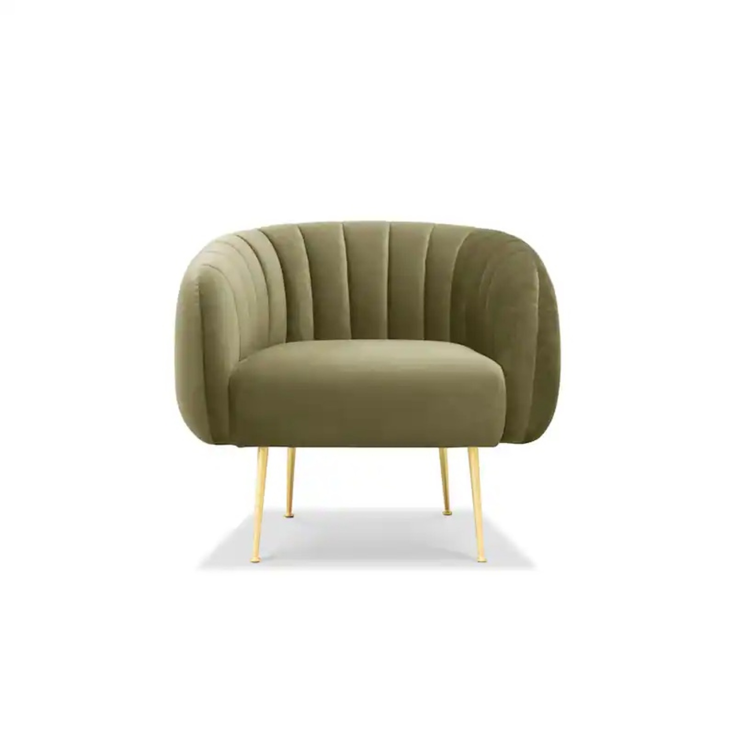 The Channeled Accent Chair features a curved, barrel-back characterized by channel welting. Channeled is available in several colorways in durable velvet and sits atop brass legs for a touch of glam.