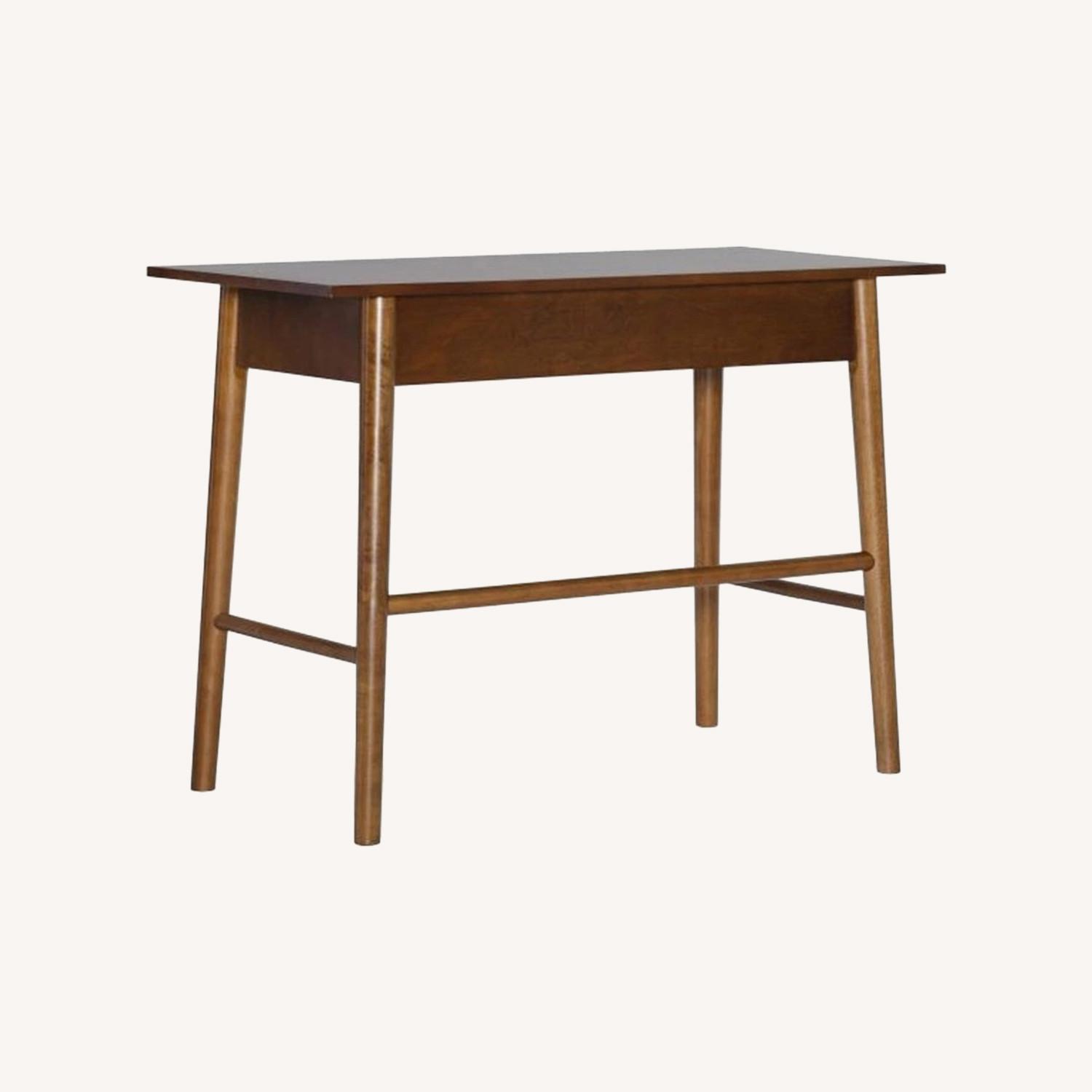 Seller's Notes:Whether you’re working from home or just need a comfortable place to pen correspondence, this modern desk is an elegant addition to your home. Its midcentury design features sturdy rounded legs set at an angle and an expansive workspace. The front drawer, adorned with a simple black knob, provides storage for supplies. Finished in a warm walnut shade birch veneer, this desk will complement any decor or room, including the office, bedroom, kitchen or living room. It’s most at home with similar pieces in the same collection. Overall Width: 42” Overall Depth: 19” Overall Height: 30” Floor to Apron Height: 24.4” Drawer Width: 20.7” Drawer Depth: 10.86” Drawer Height: 2.55”