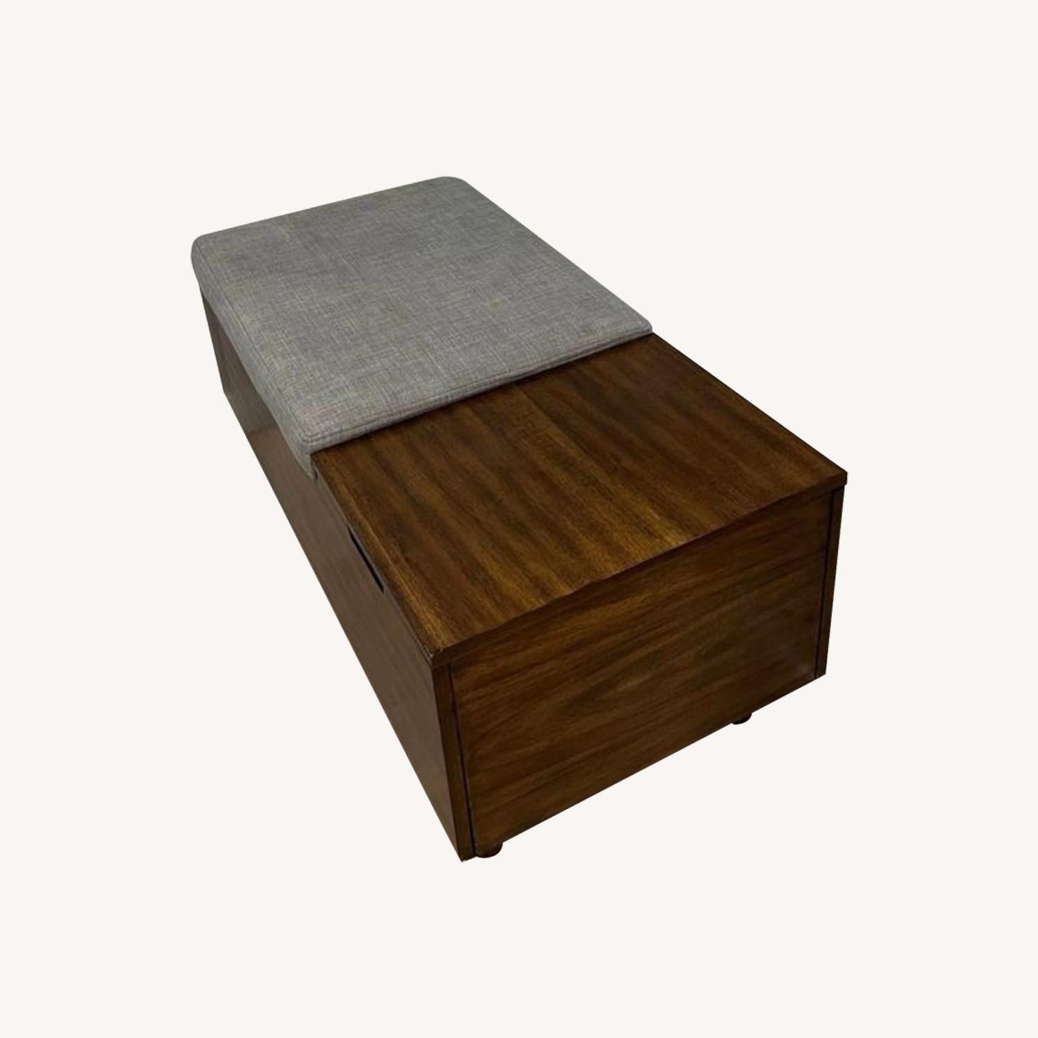 Seller's Notes:. A portion of the top is covered in padded, linen upholstery for a comfy spot to sit, while the two flip tops easily flip open to reveal ample space to store extra throw blankets, pillows and more. Discounted for water stains; selling as unfortunately does not match new furniture.