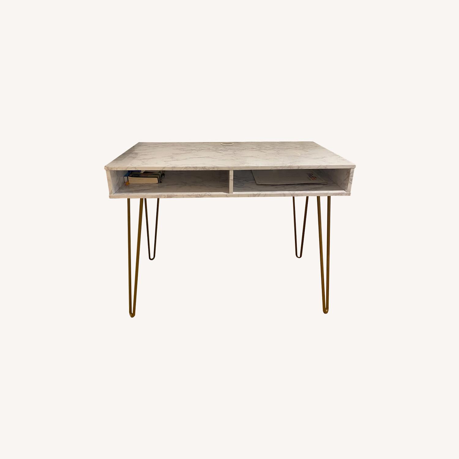 Seller's Notes:Desk features a faux white marble finish on the PVC laminated particleboard that pairs with the gold powder-coated metal hairpin legs for an elegant, retro style. The minimalist design makes this Desk a perfect addition to your dorm room or small apartment. The desktop is large enough for you to finish homework or browse social media on your laptop. The 2 open cubbies allows you to store notebooks, writing utensils, and papers off of the desktop but still within reach to keep your workspace clutter free.